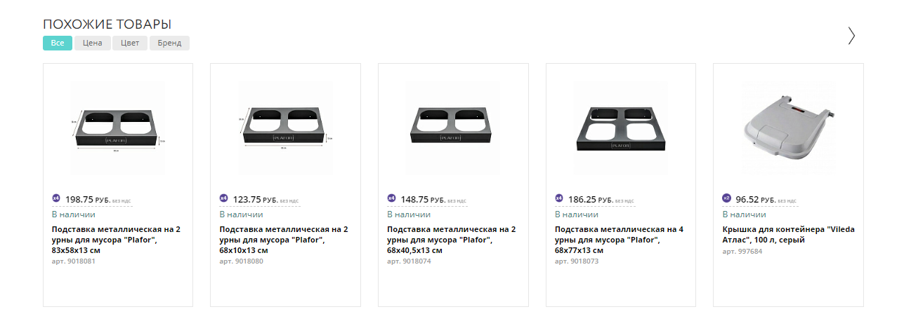 Если товар на сайте временно не доступен к продаже, мы не прячем товар, а предлагаем выбрать аналог. Такую же логику мы выводим в корзине. Товары аналоги группируются по свойствам фильтра и дают пользователю возможность самому выбрать ту характеристику, по которой он хочет выбрать аналог. Например, если мы говорим о бумаге, это может быть как Формат (A4, A5 и т. д.), так и качество бумаги (плотность), цена, количество листов в упаковке и т. д.