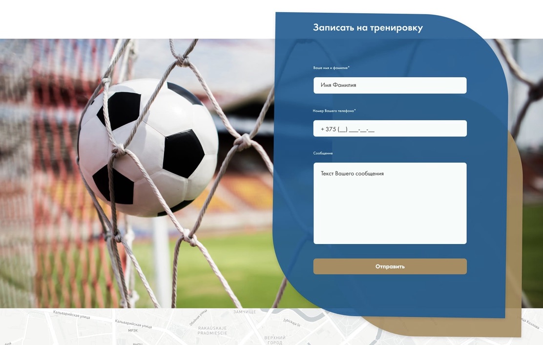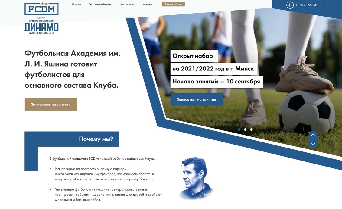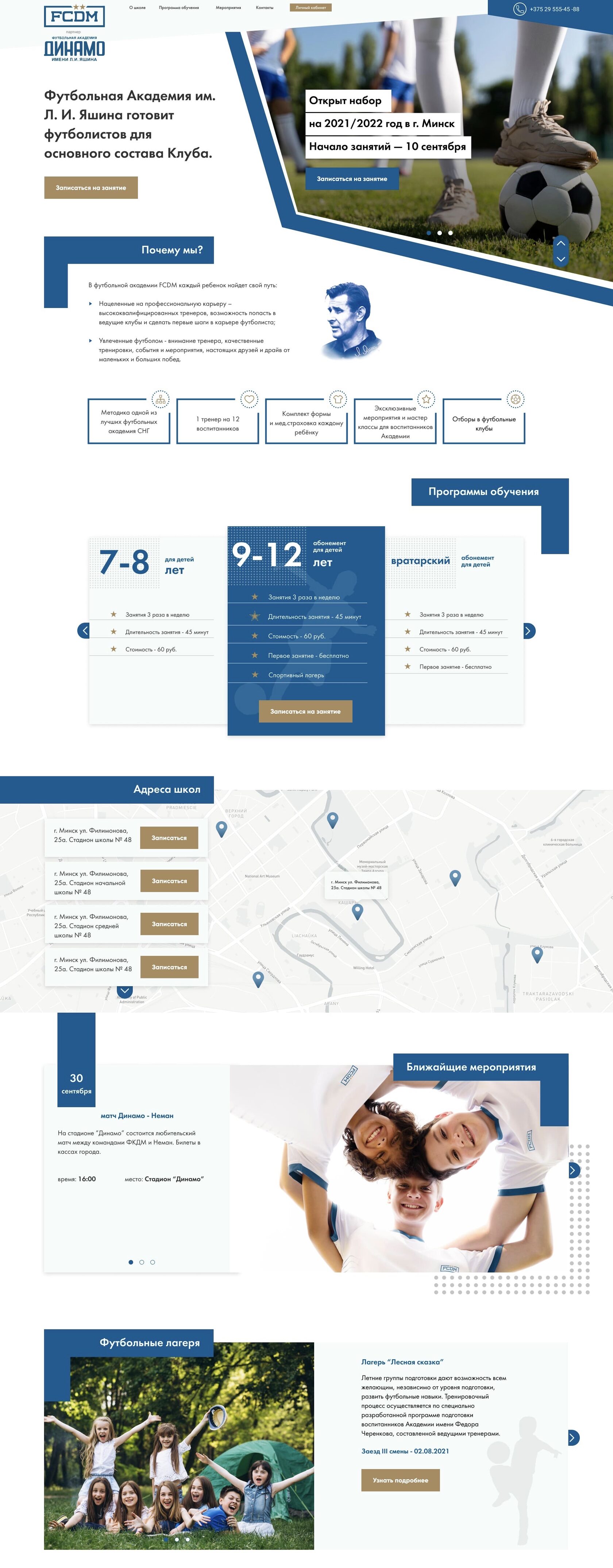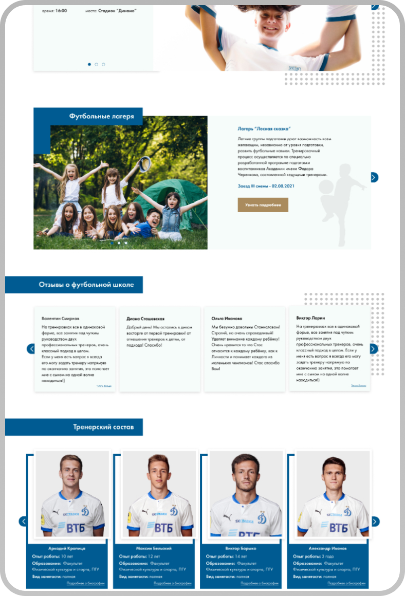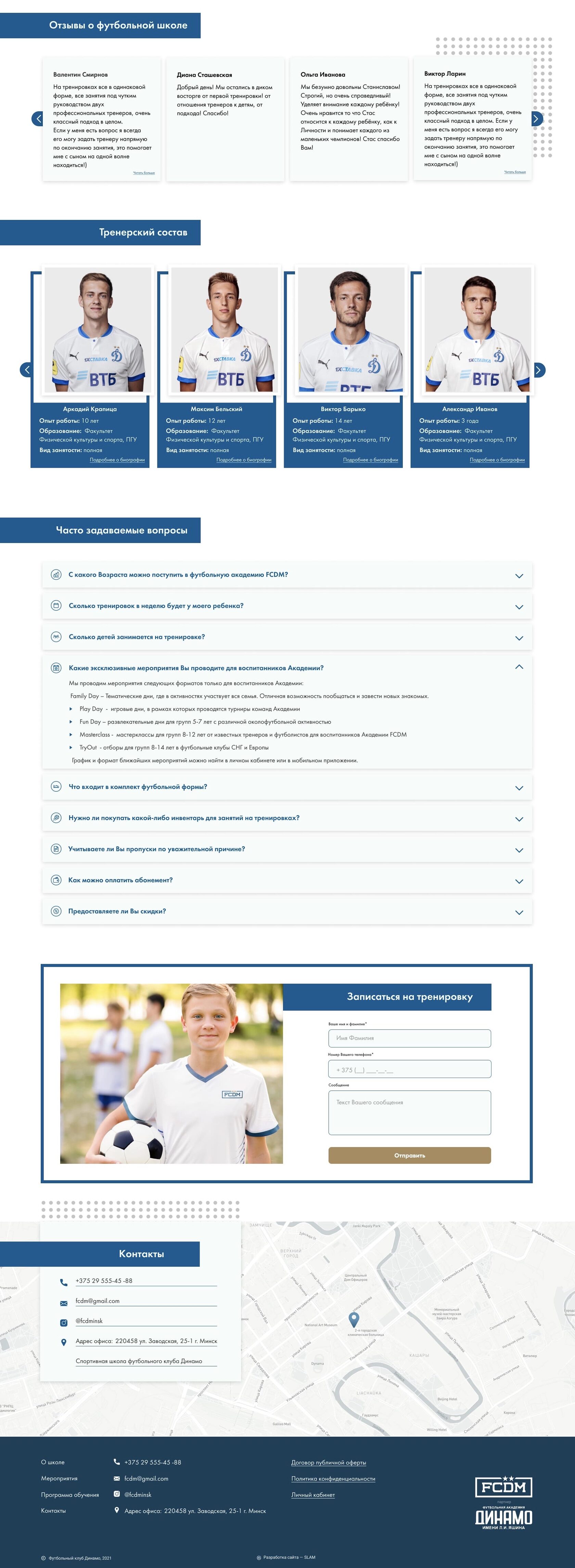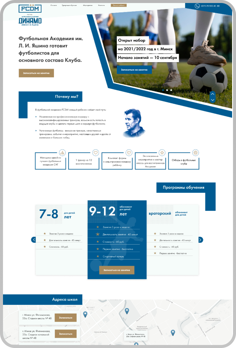 На странице доступна информация о преимуществах футбольной школы, тарифных планах на обучение, собрана подробная информация о тренерском составе, рассказывается о последних событиях и мероприятиях, создана интерективная карта с адресами школ.