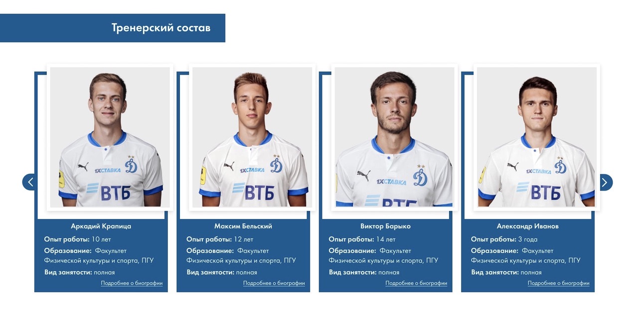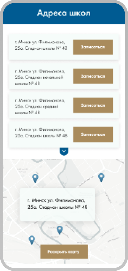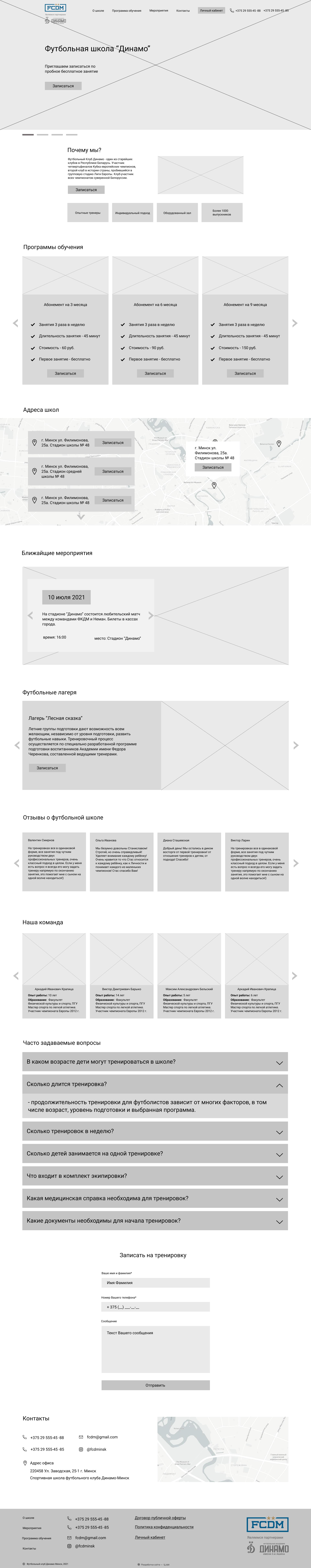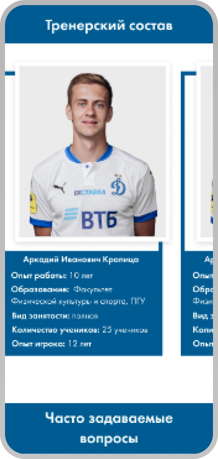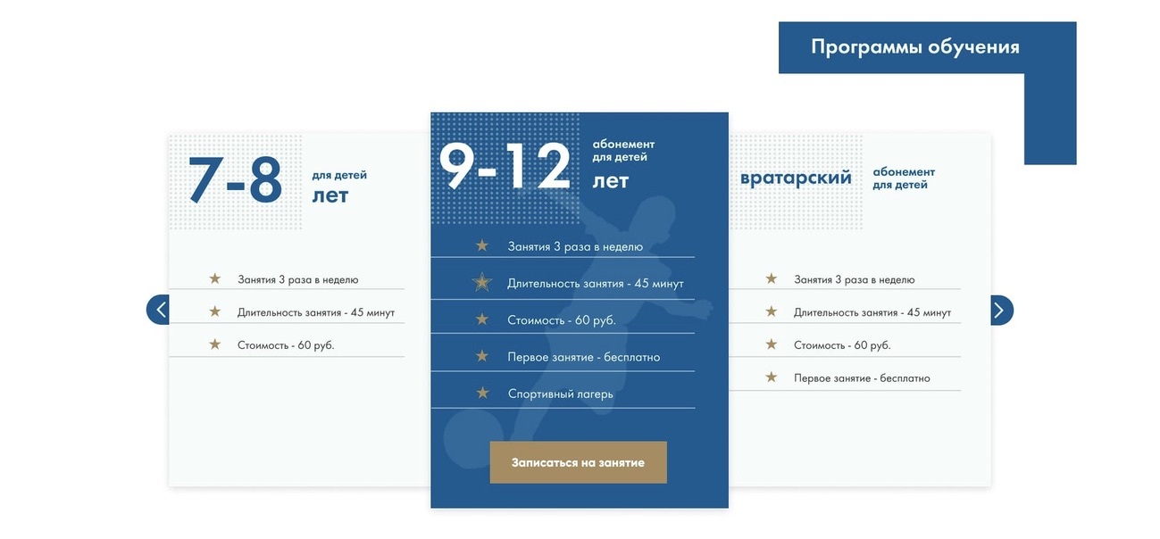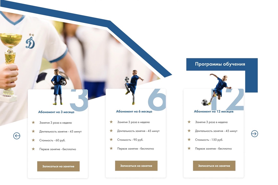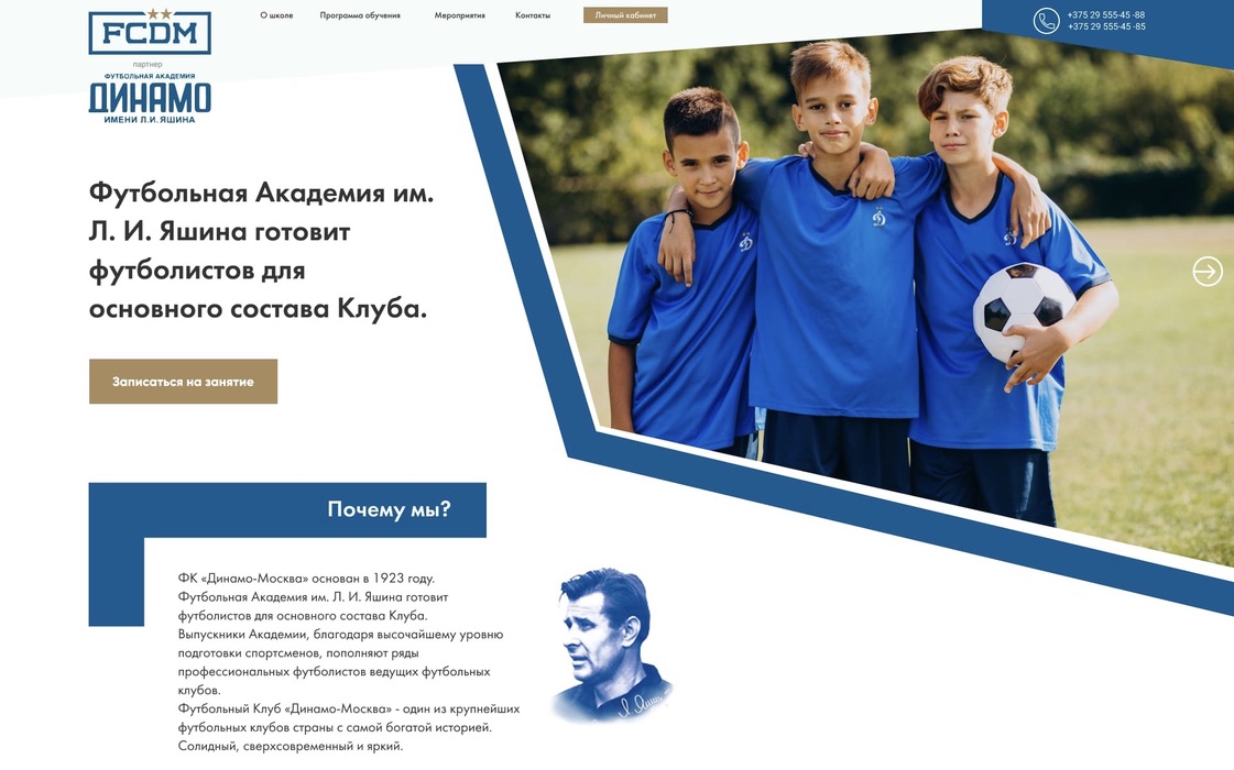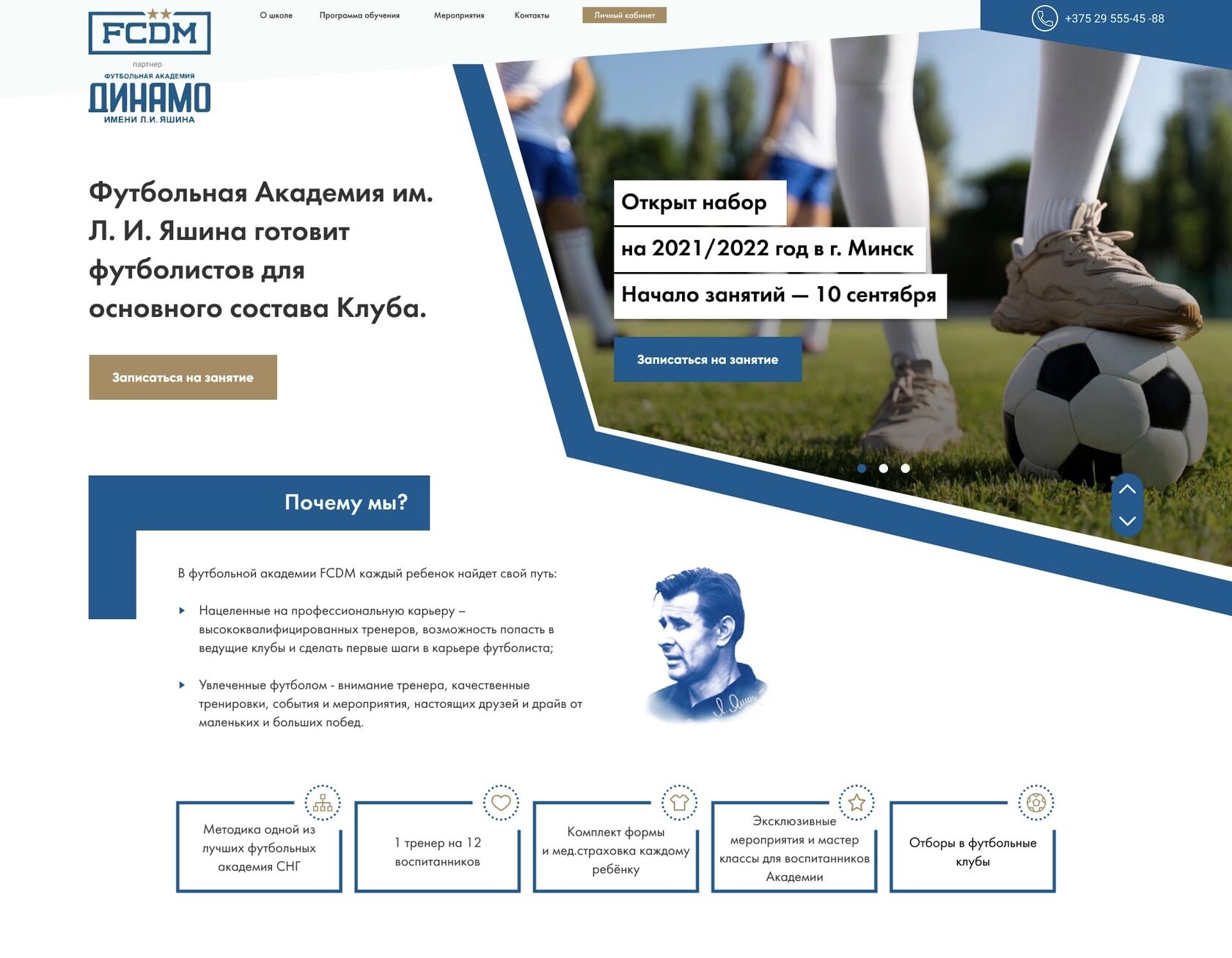 На странице доступна информация о преимуществах футбольной школы, тарифных планах на обучение, собрана подробная информация о тренерском составе, рассказывается о последних событиях и мероприятиях, создана интерективная карта с адресами школ.