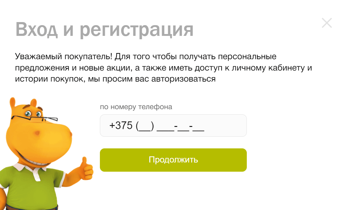 Обязательным этапом оформления заказа является авторизация пользователя. Это необходимый элемент логики, потому что сразу после авторизации пользователя мы можем запрашивать карту лояльности. Авторизация и первая регистрация на сайте происходит через ввод номера телефона и получение SMS-кода.