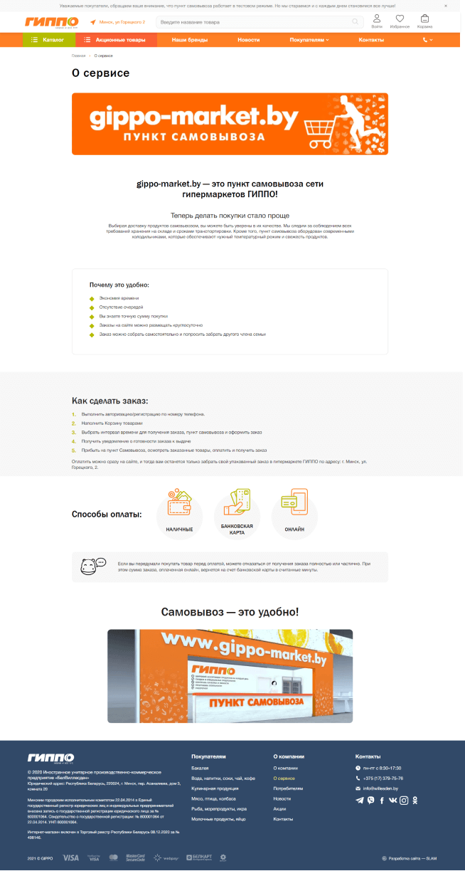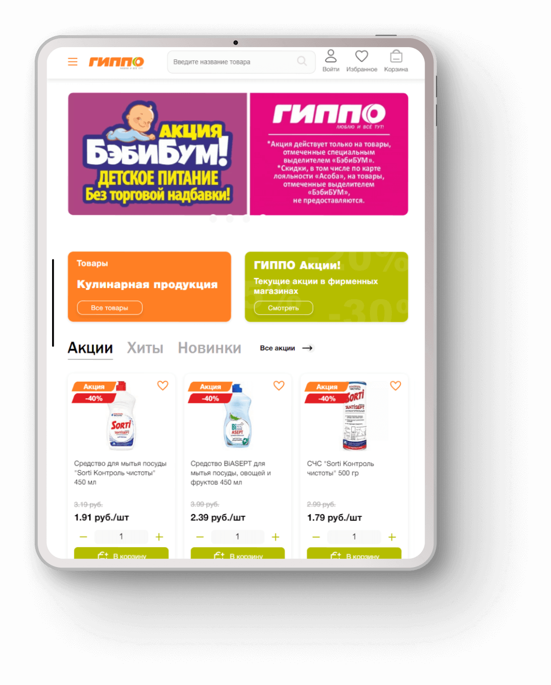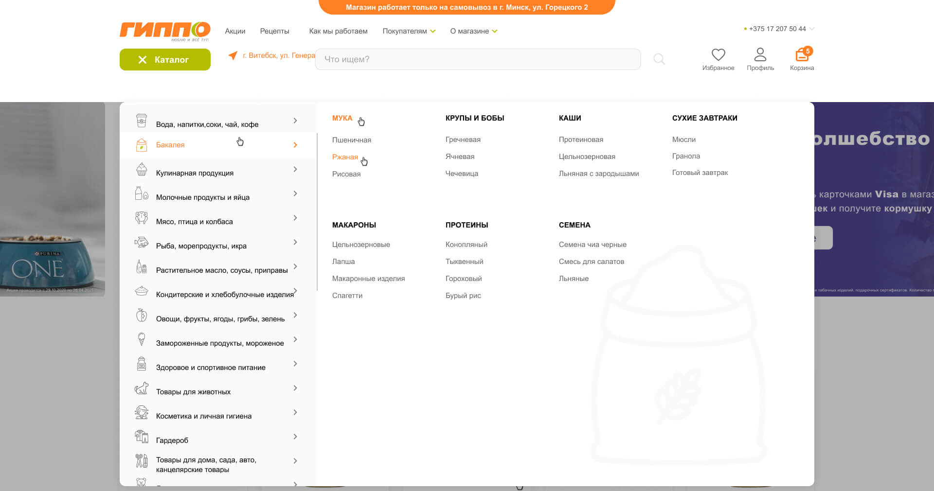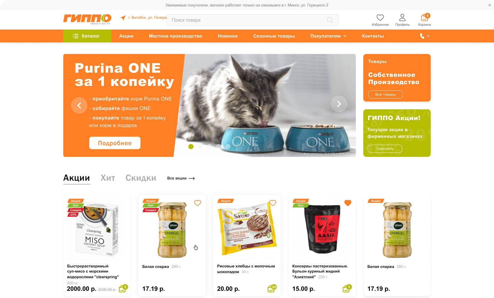 Гиппо market — интернет-магазин продуктовой сети Гиппо. На сайте реализована возможность покупки продуктов онлайн, личного кабинета