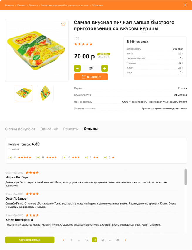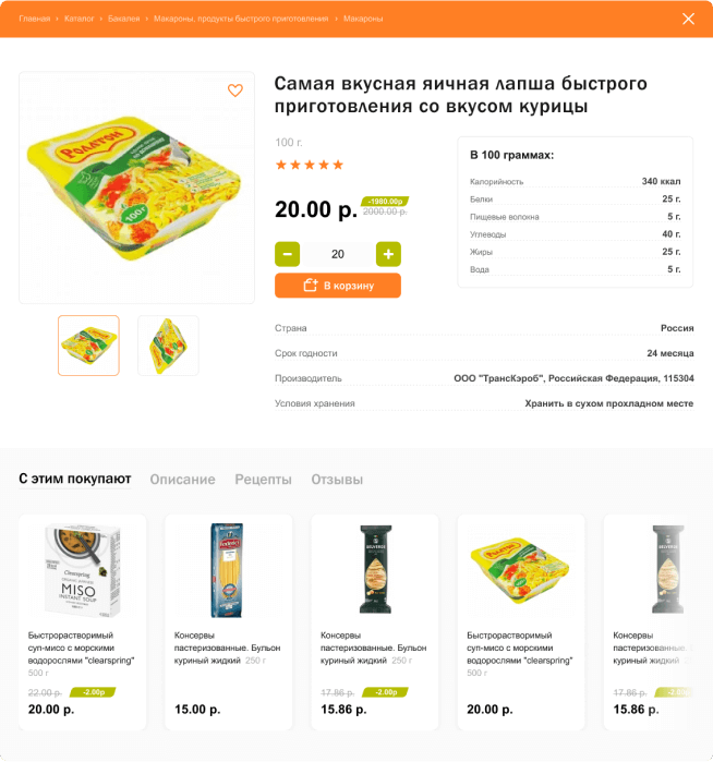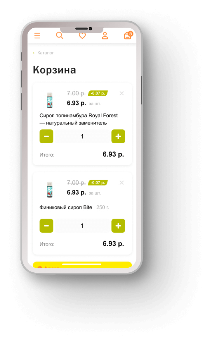 Сразу после того, как пользователь добавляет товар в корзину, все товары резервируются на два часа. Корзина автоматически добавляет к заказу нужное количество пакетов или другую тару, если какой-то из продуктов идет в определенной упаковке.