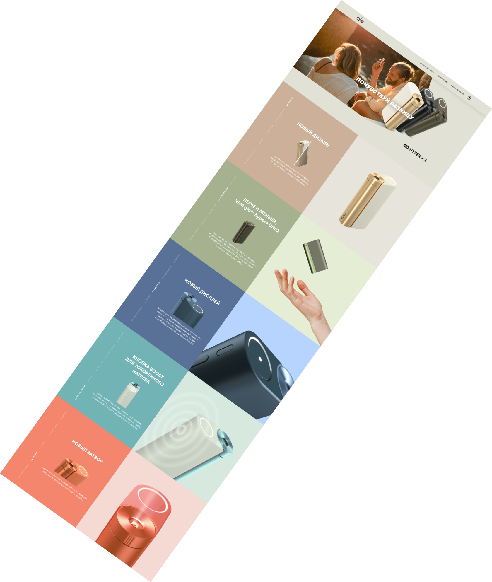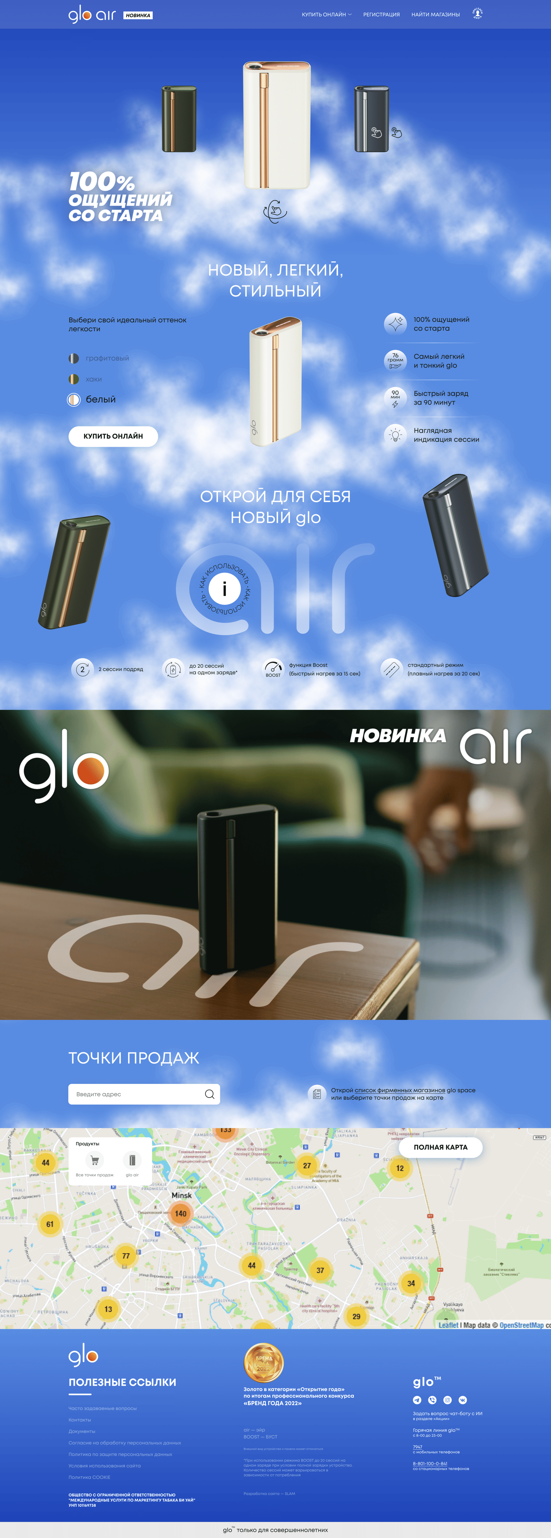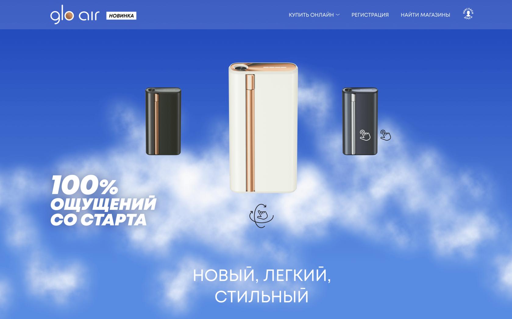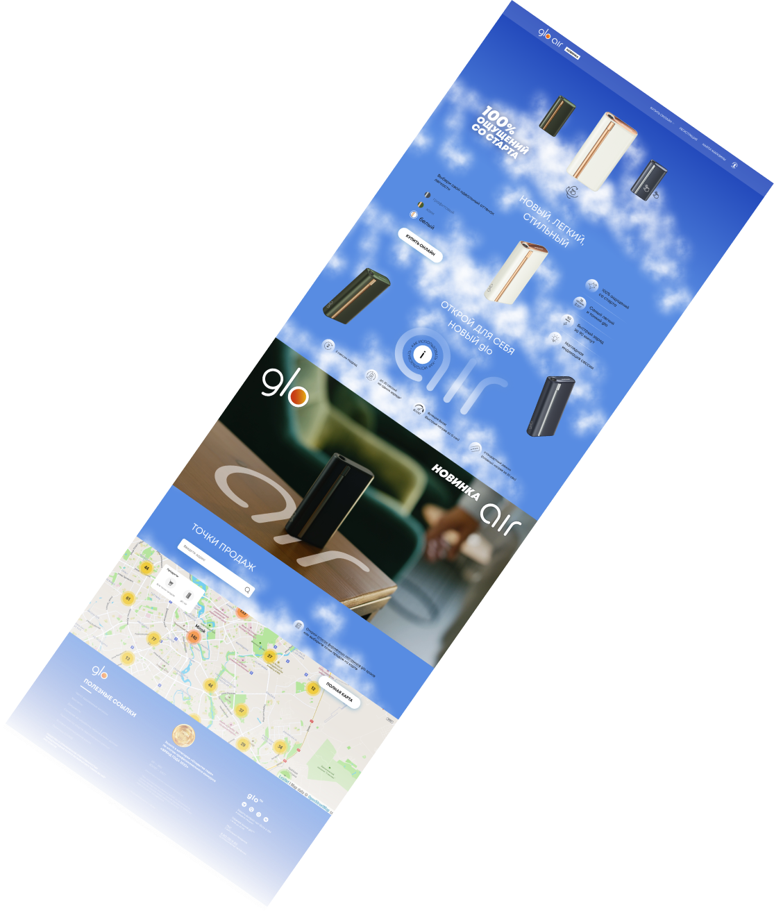 При разработке лендинга для последней линейки glo™ air мы работали с 3d-моделями устройств, которые можно рассмотреть под любым углом, управляя курсором.