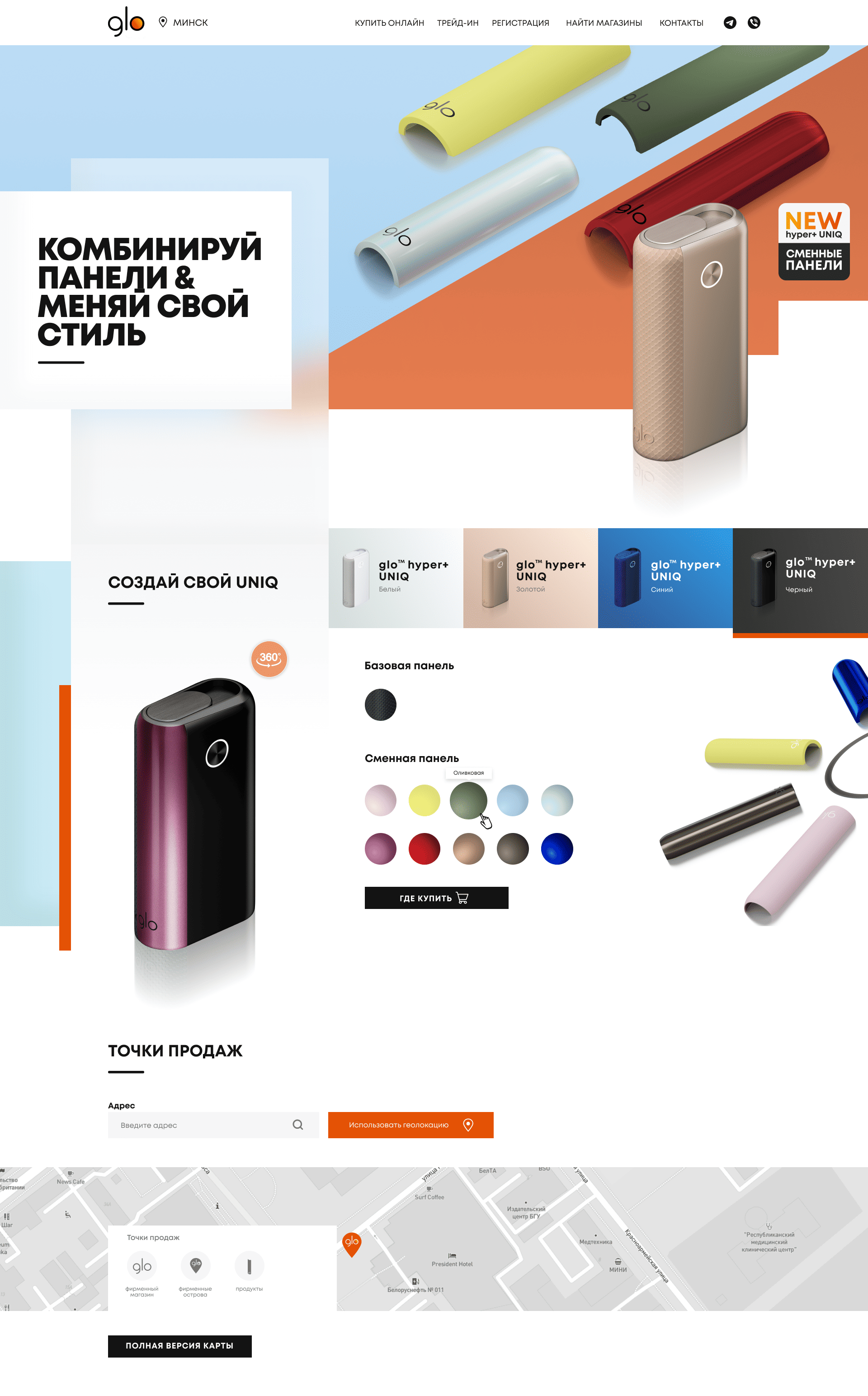 Для линейки устройств glo™ hyper+ UNIQ был спроектирован и разработан конфигуратор, который отображался на главной странице, разводящей странице устройств в интернет-магазине, а также в карточке товара. Также была разработана кастомная механика покупки устройства с одной базовой и одной бесплатной панелью на выбор через конфигуратор.