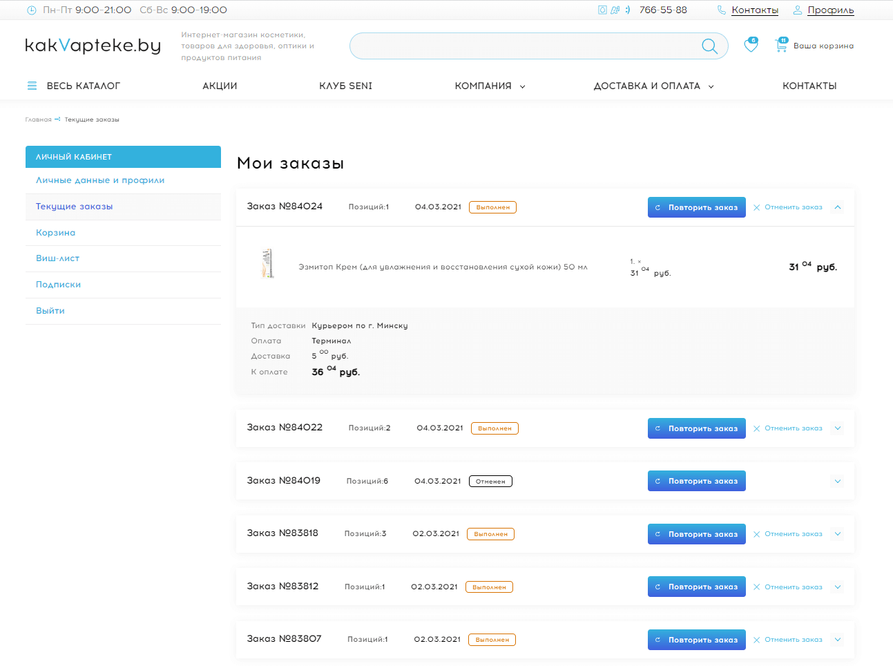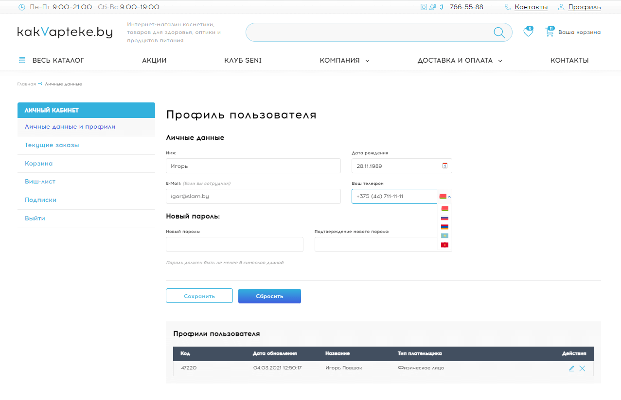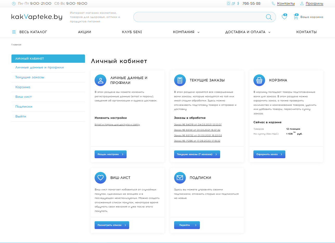 Личный кабинет имеет полный классический набор функционала современного интернет-магазина:
