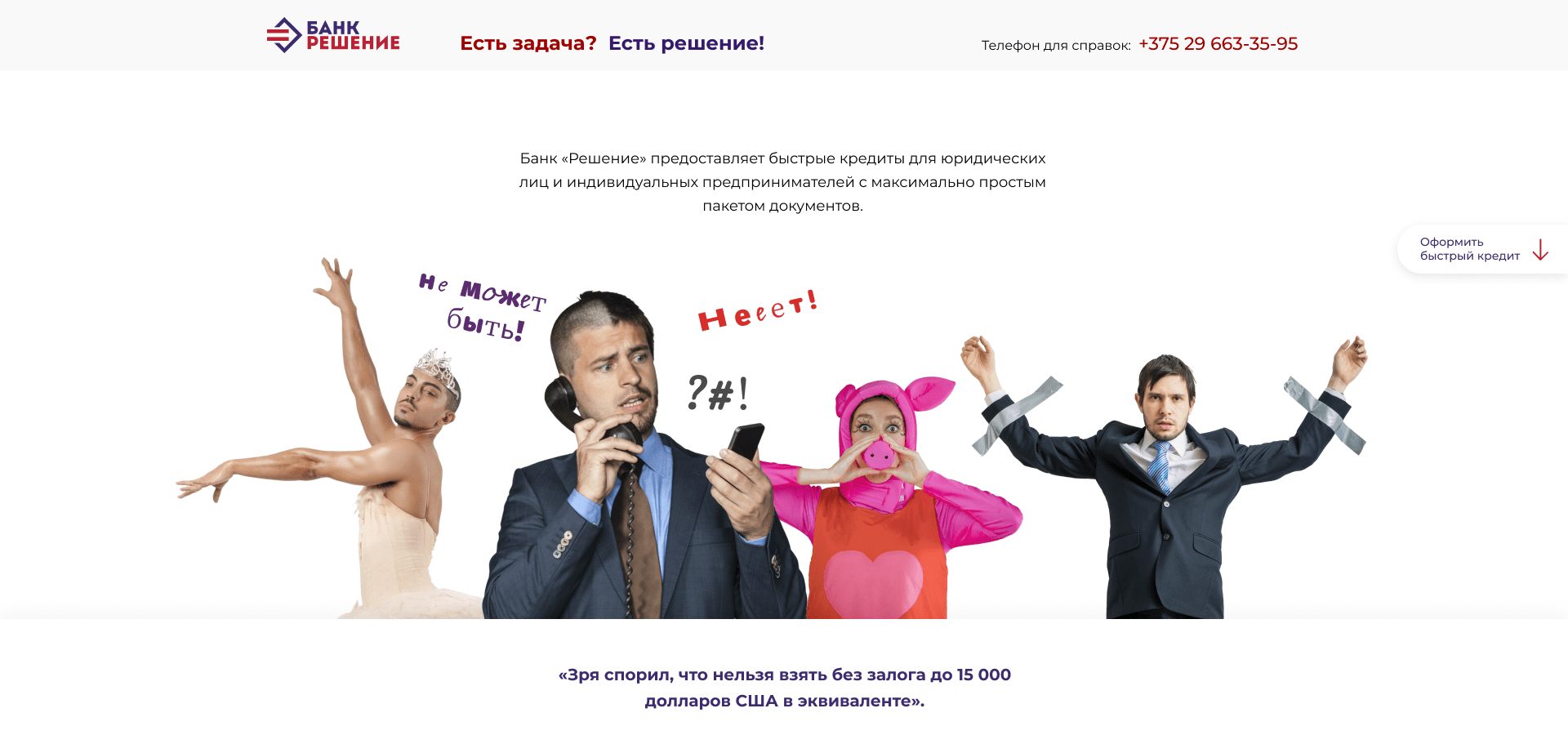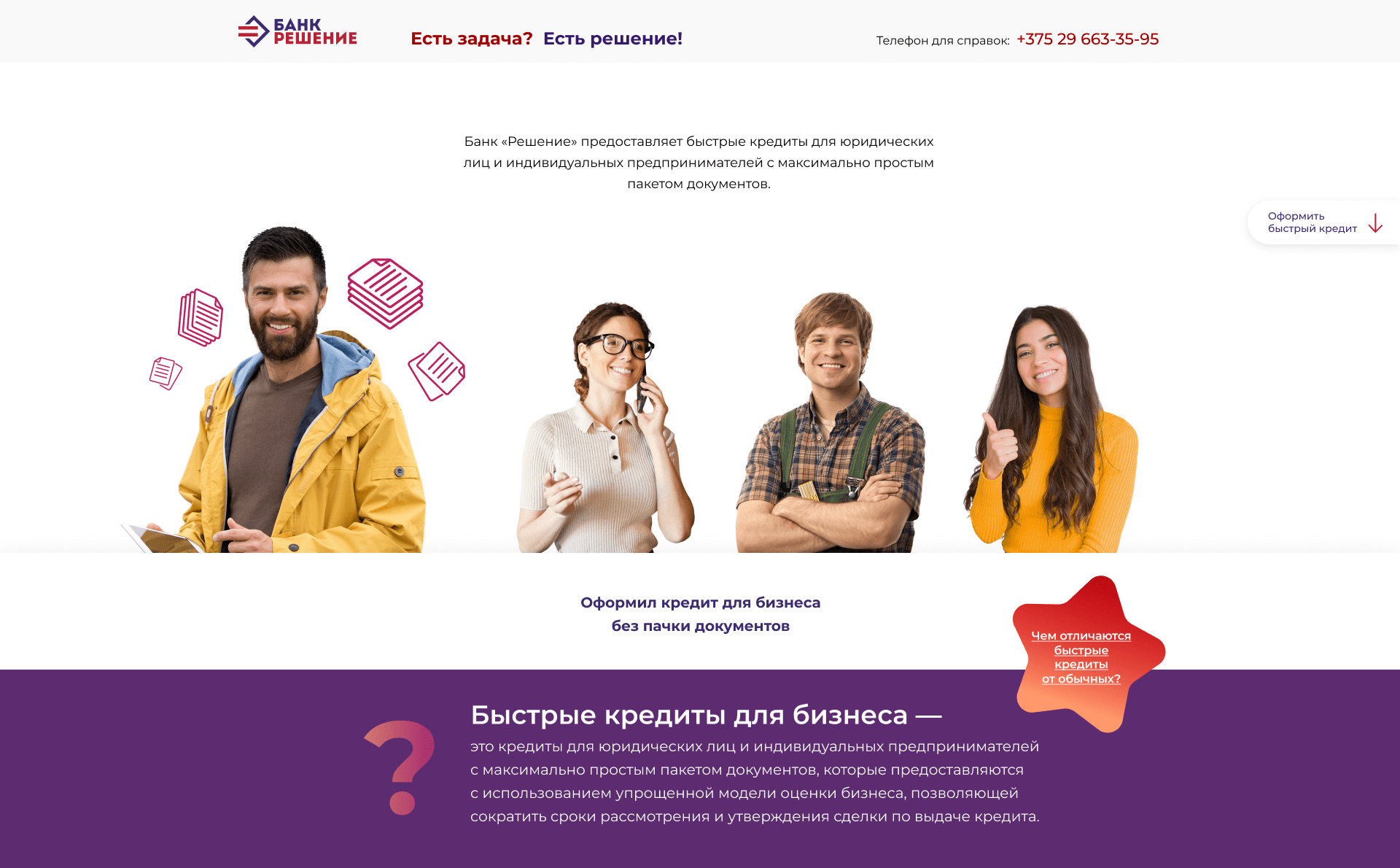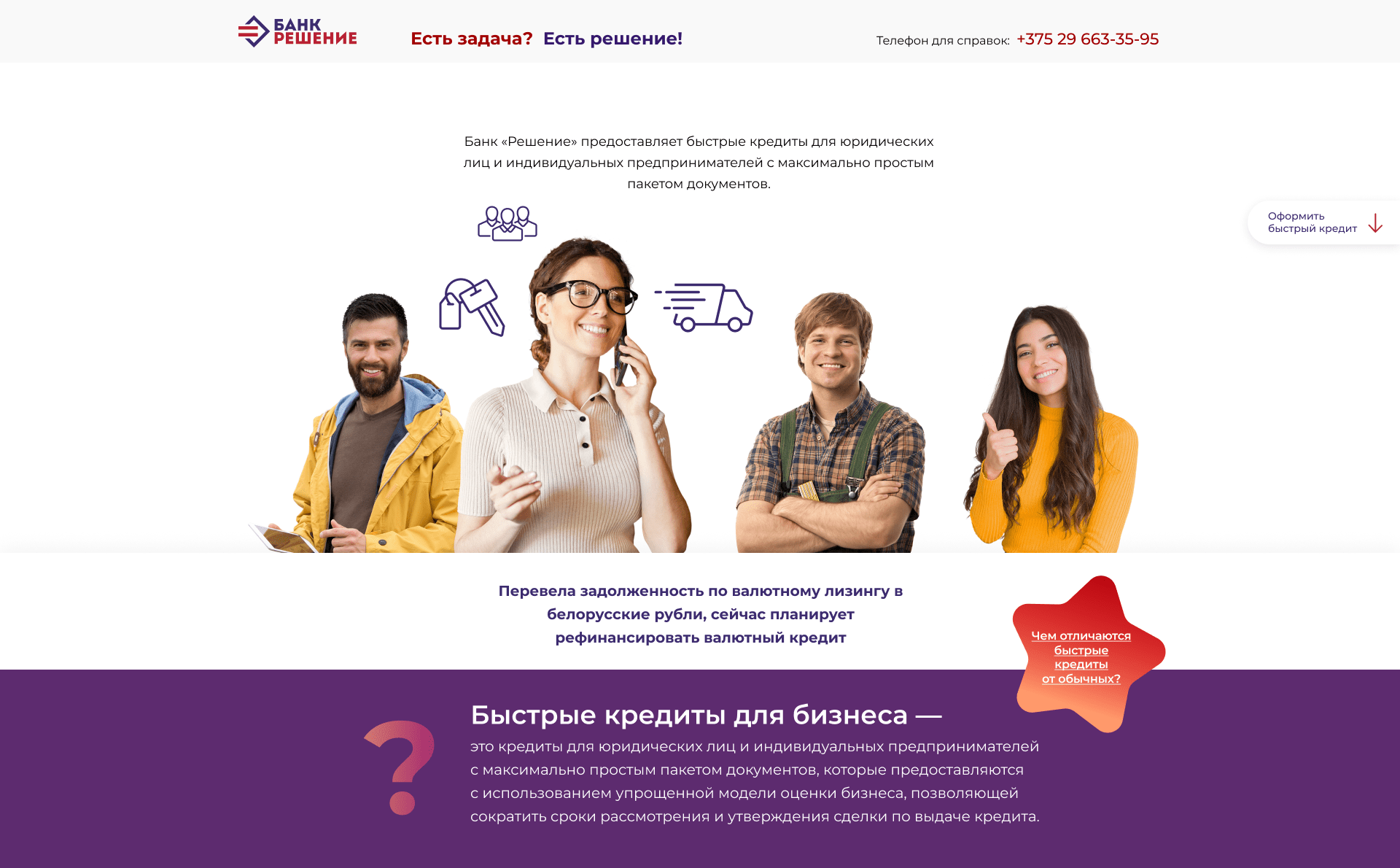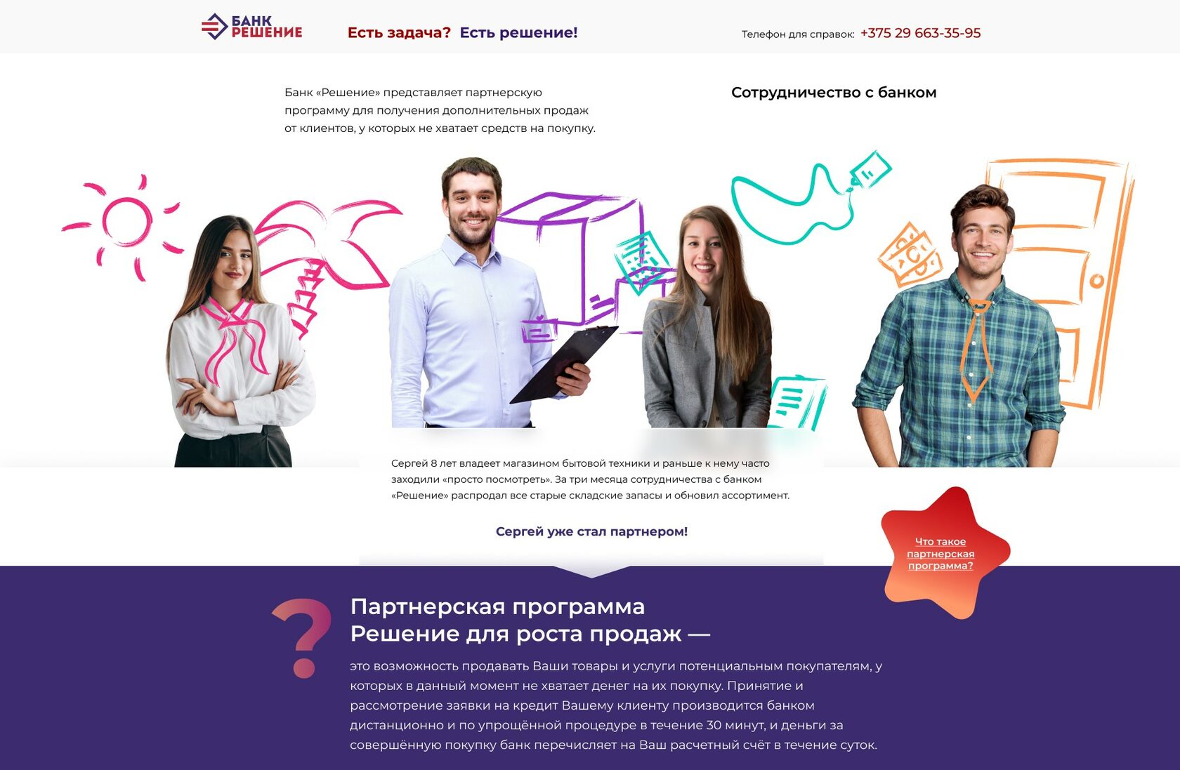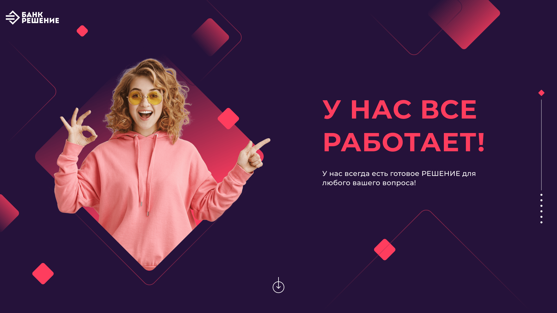 С 2019 года мы занимаемся поддержкой корпоративного сайта Банка Решение, за этот период мы косметически обновили дизайн корпоративного сайта, разработали новый сайт банка, а еще мы сделали много посадочных страниц для разных отдельных продуктов Банка.