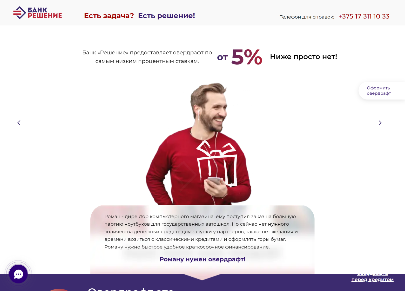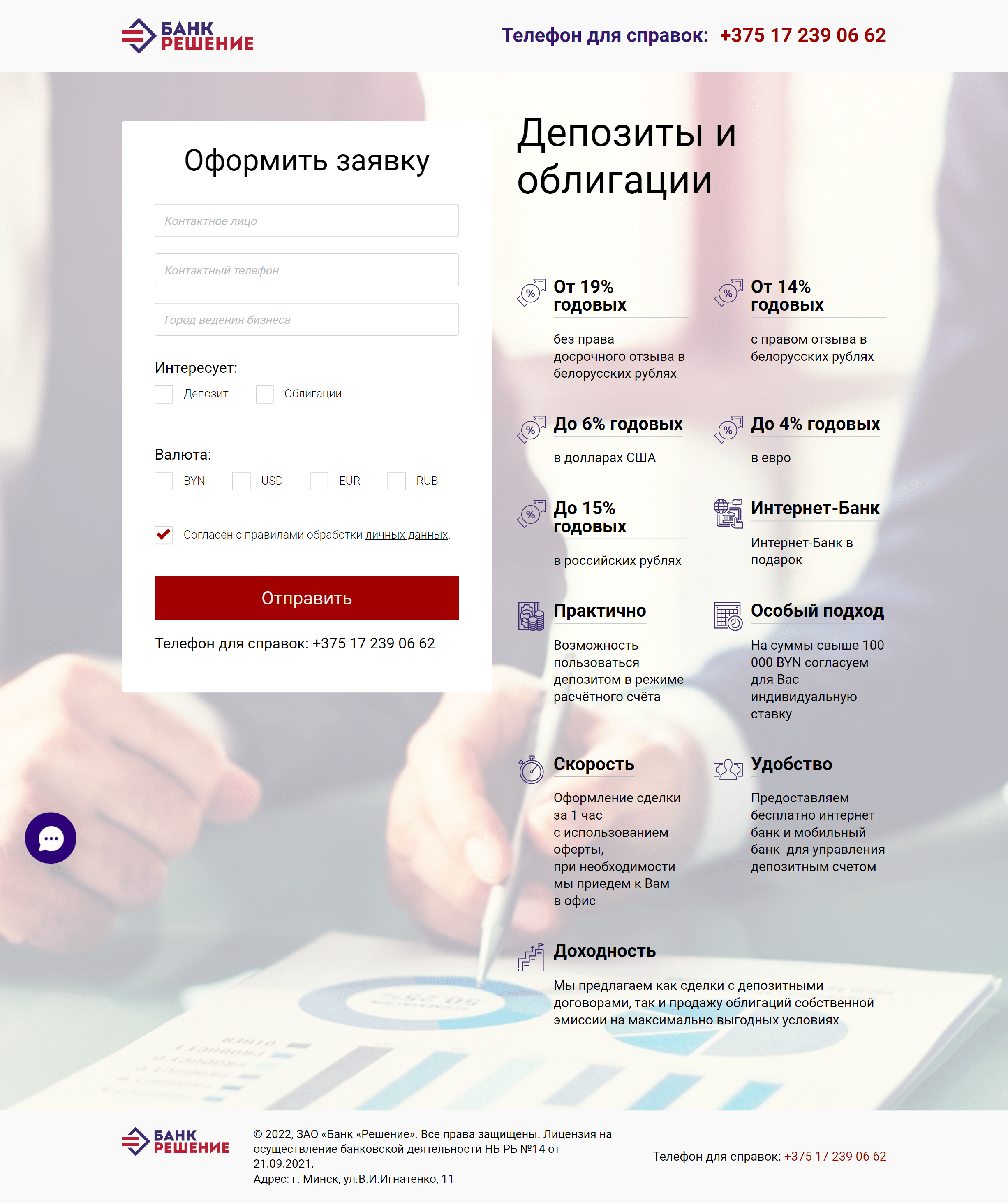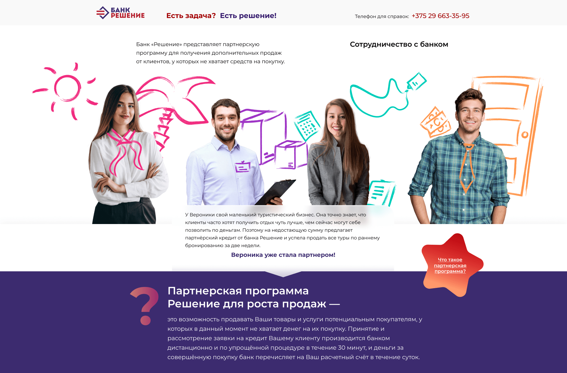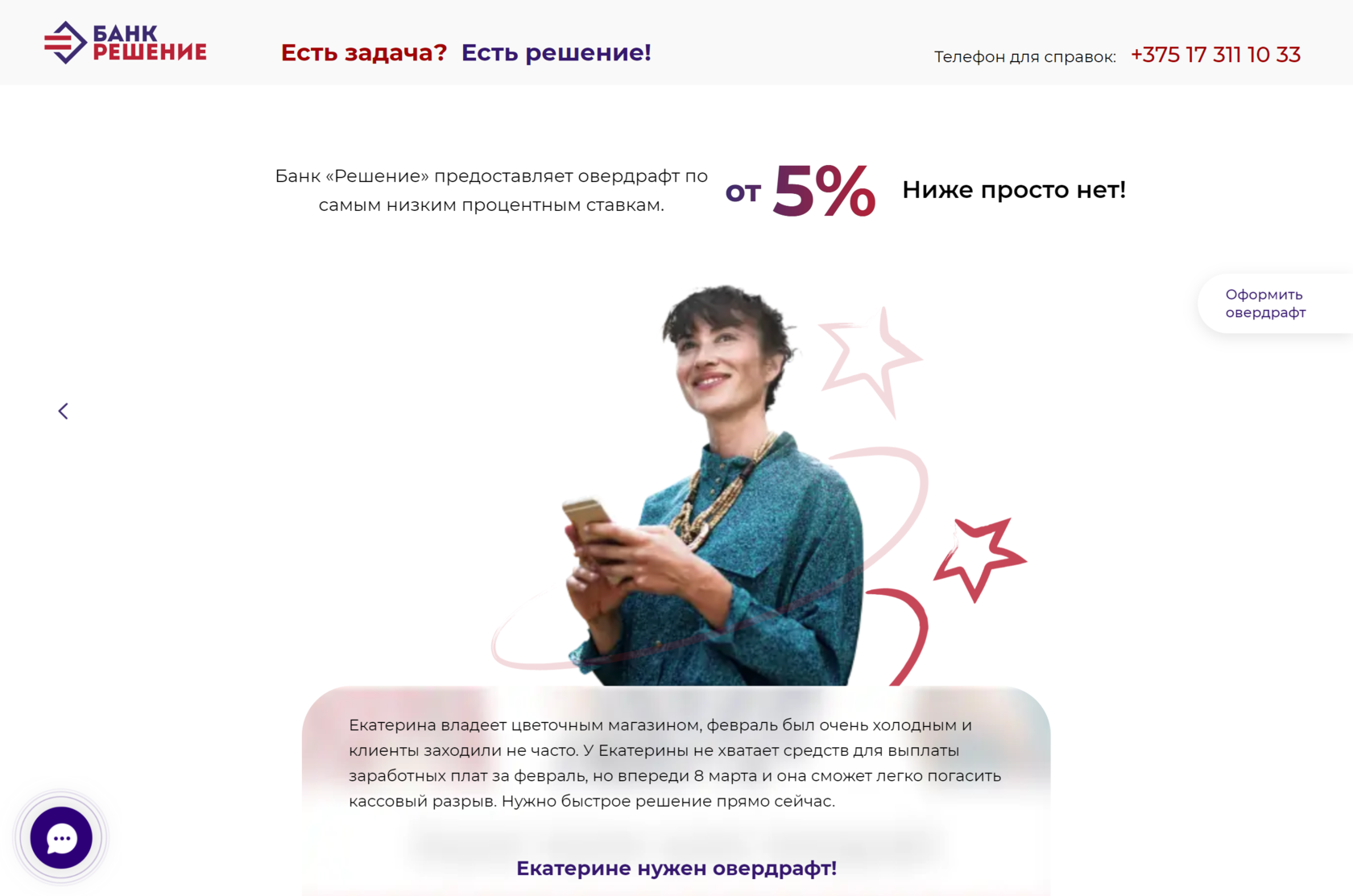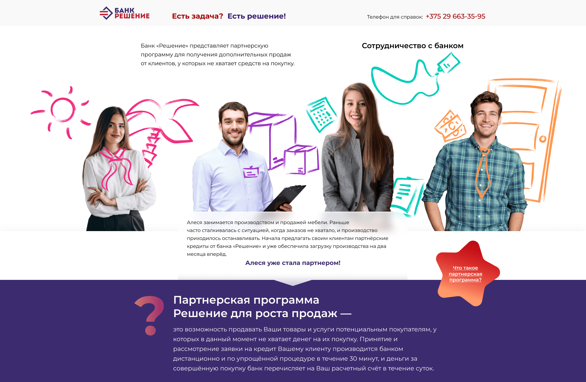 С 2019 года мы занимаемся поддержкой корпоративного сайта Банка Решение, за этот период мы косметически обновили дизайн корпоративного сайта, разработали новый сайт банка, а еще мы сделали много посадочных страниц для разных отдельных продуктов Банка.
