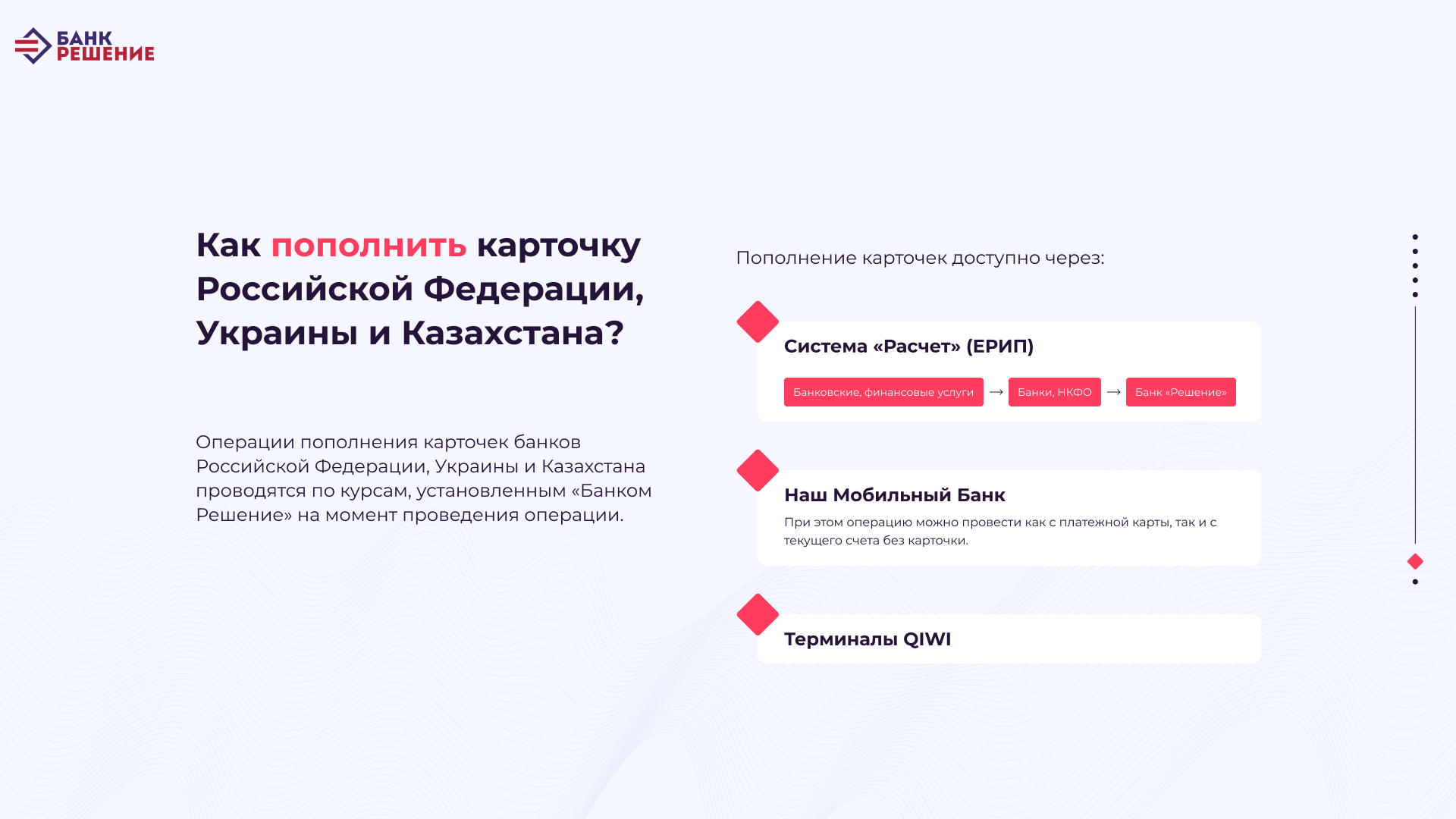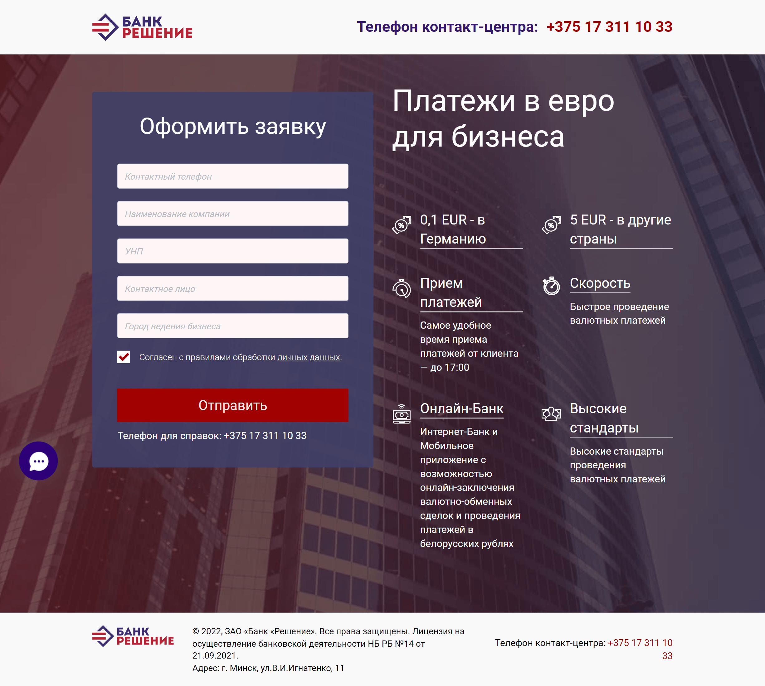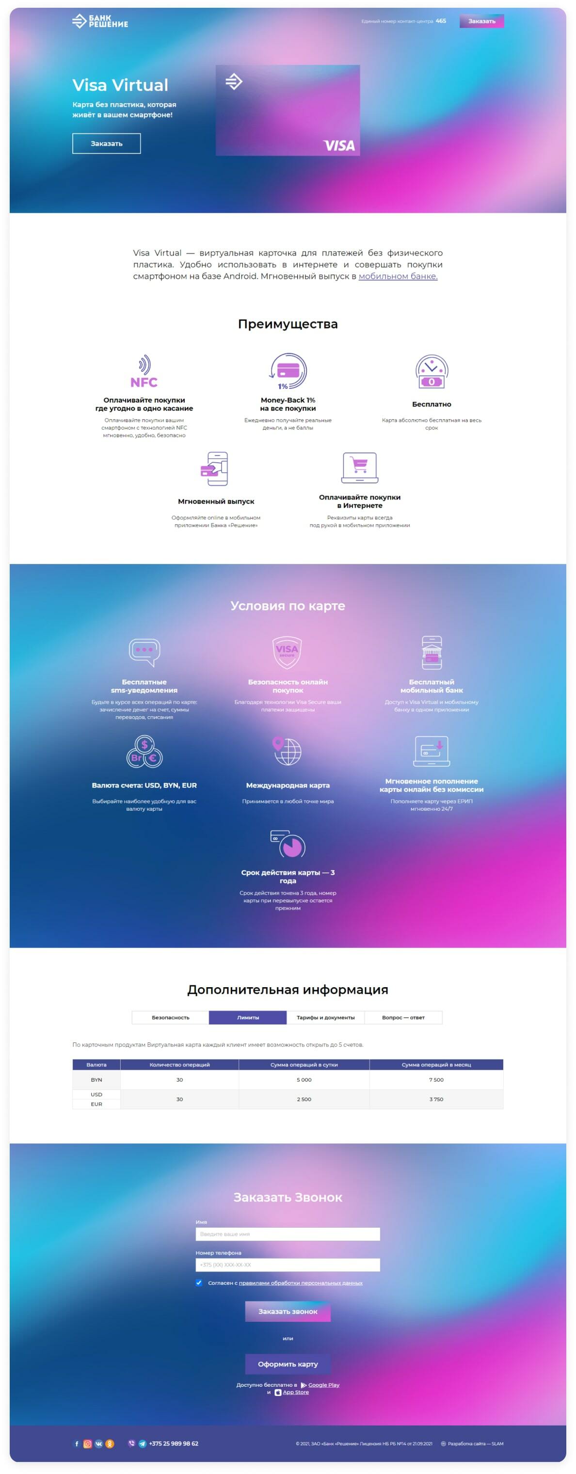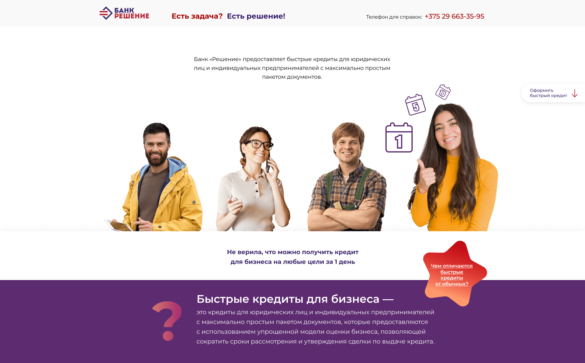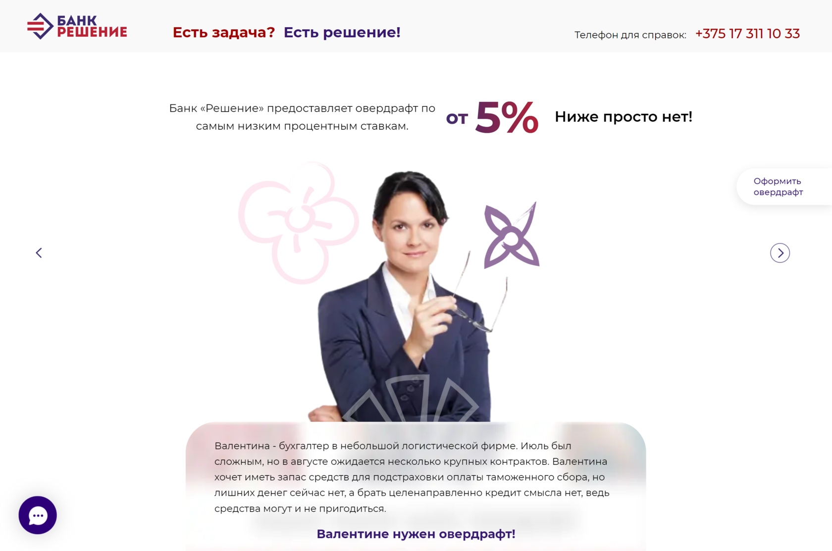 С 2019 года мы занимаемся поддержкой корпоративного сайта Банка Решение, за этот период мы косметически обновили дизайн корпоративного сайта, разработали новый сайт банка, а еще мы сделали много посадочных страниц для разных отдельных продуктов Банка.