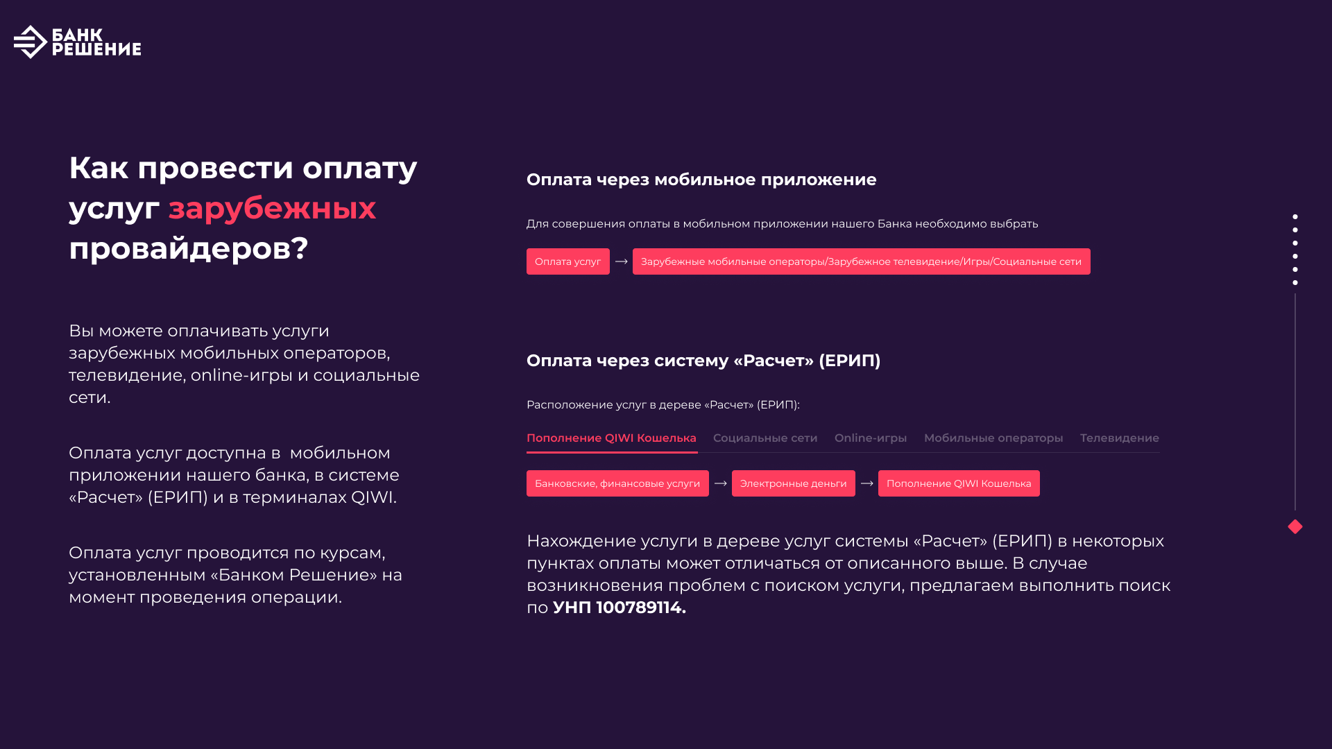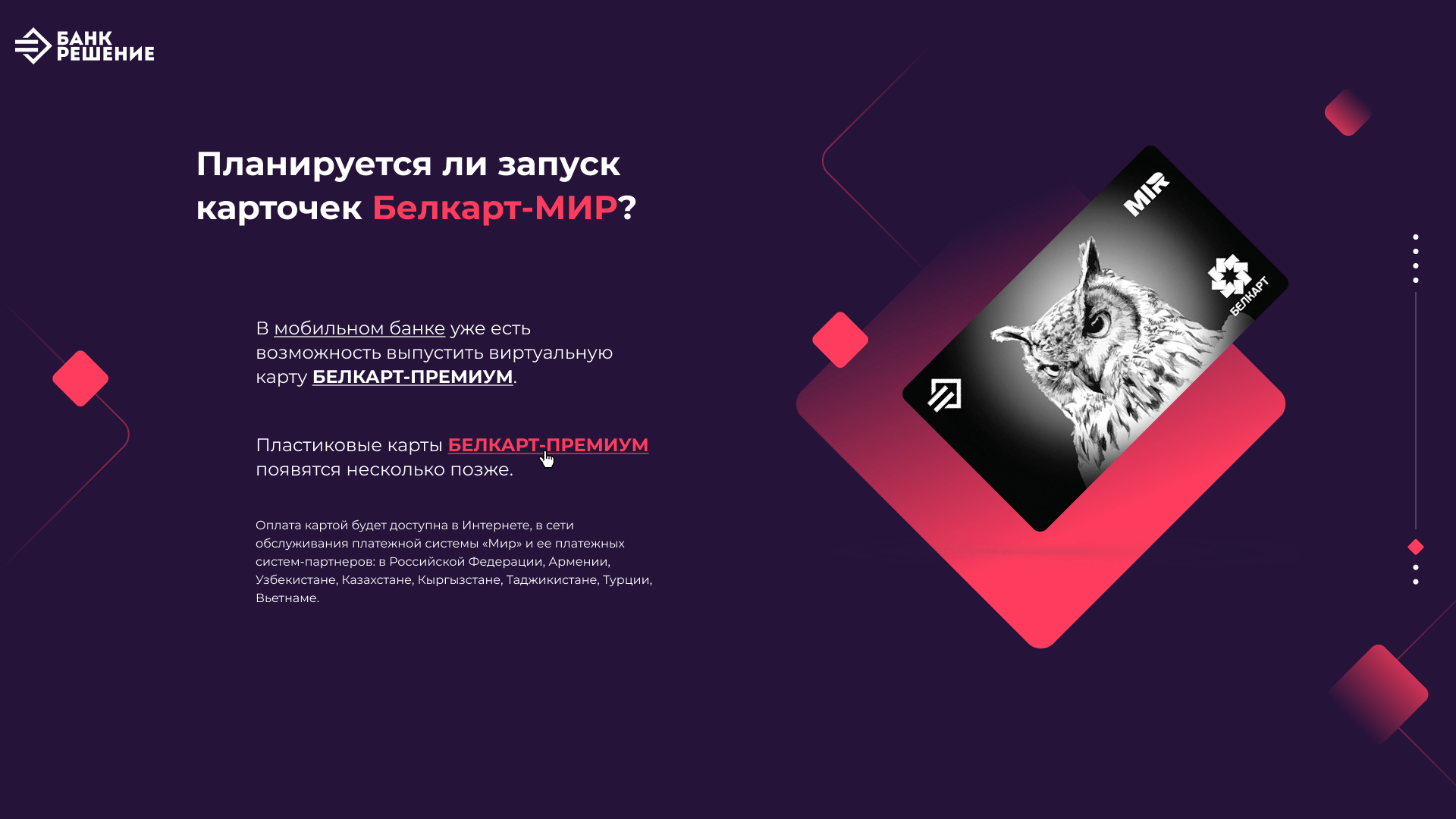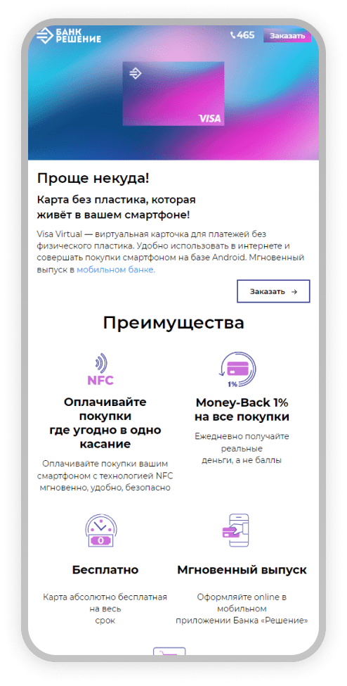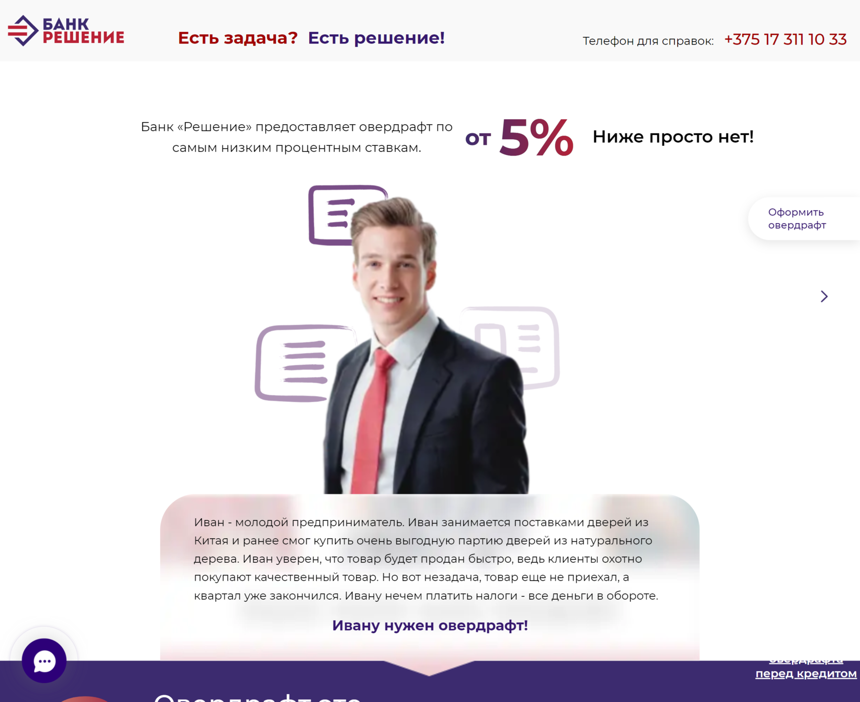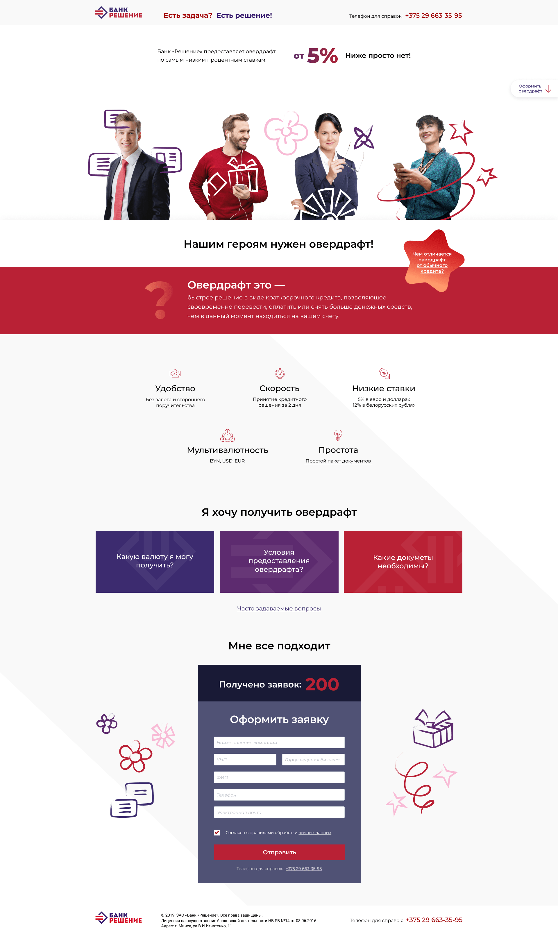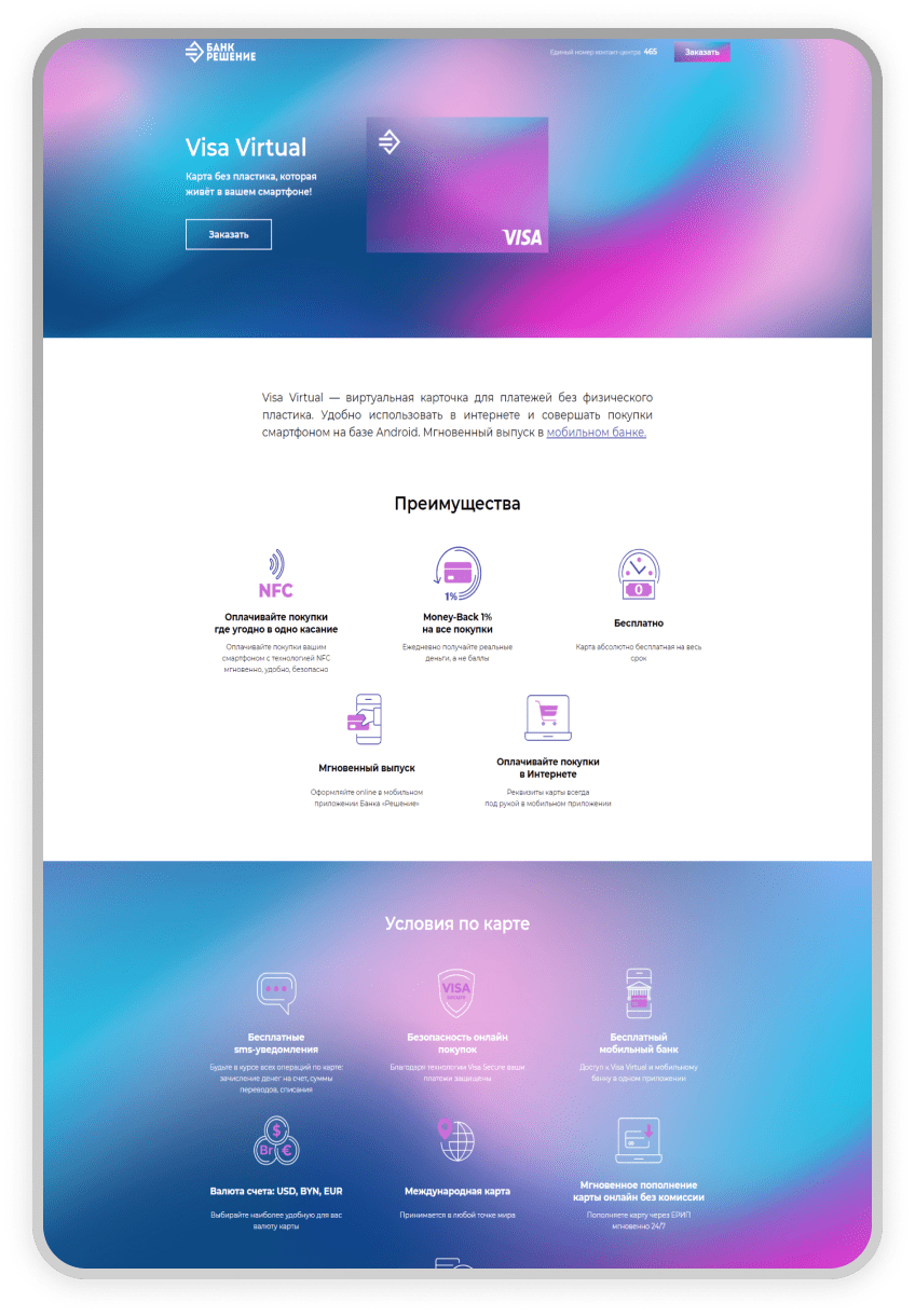 С 2019 года мы занимаемся поддержкой корпоративного сайта Банка Решение, за этот период мы косметически обновили дизайн корпоративного сайта, разработали новый сайт банка, а еще мы сделали много посадочных страниц для разных отдельных продуктов Банка.
