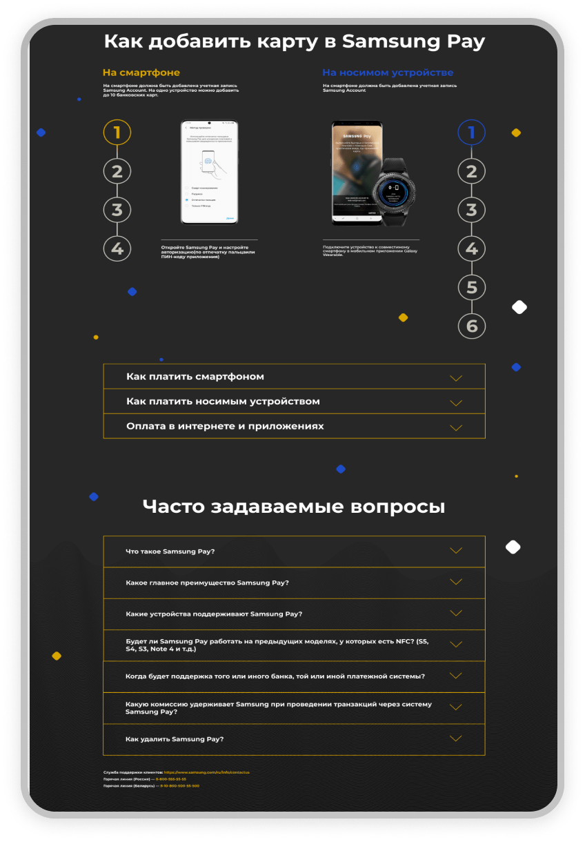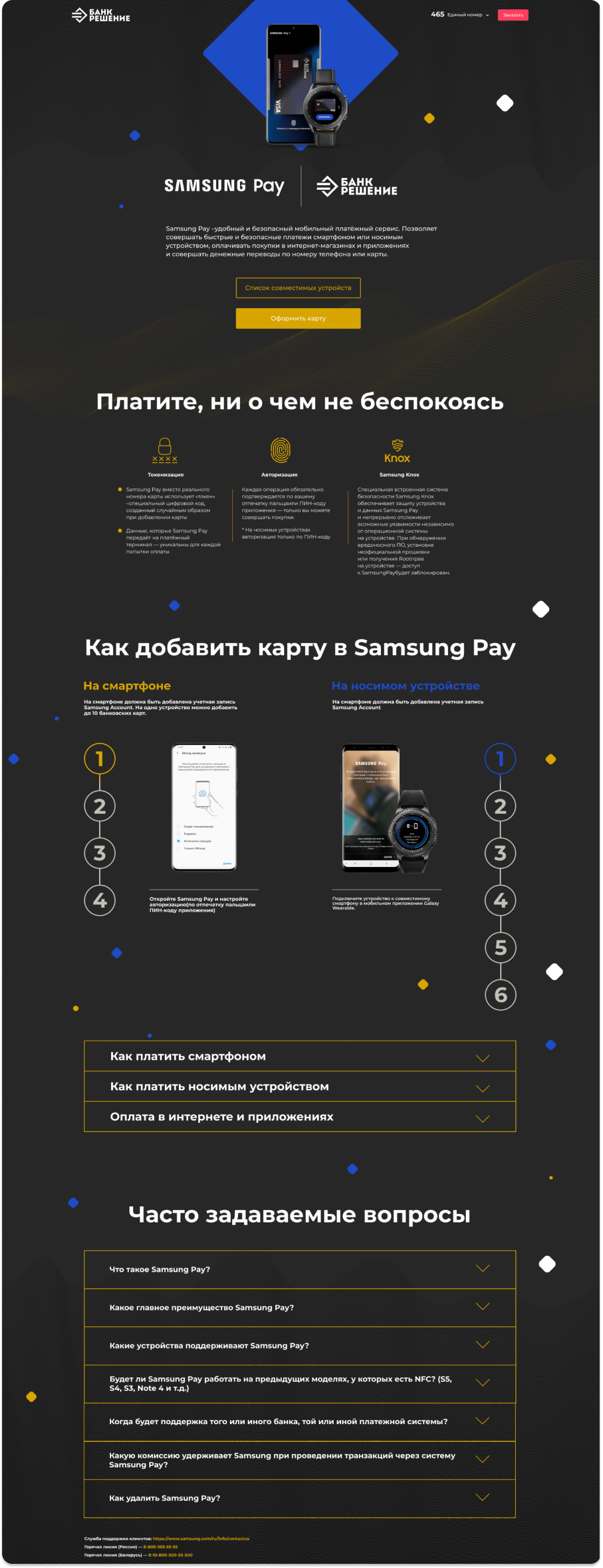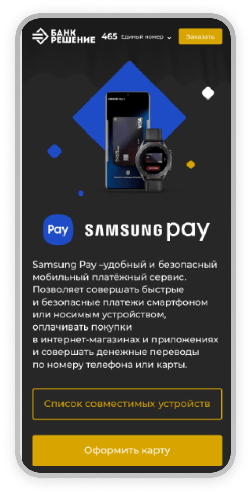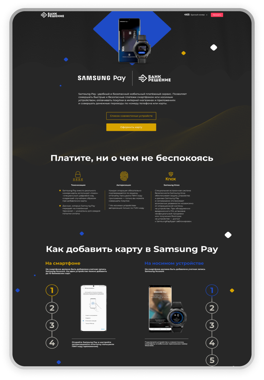 Классный лендинг для Samsung Pay — удобный и безопасный мобильный платежный сервис. Позволяет совершать быстрые и безопасные платежи смартфоном или носимым устройством, оплачивать покупки в интернет-магазинах и приложениях.