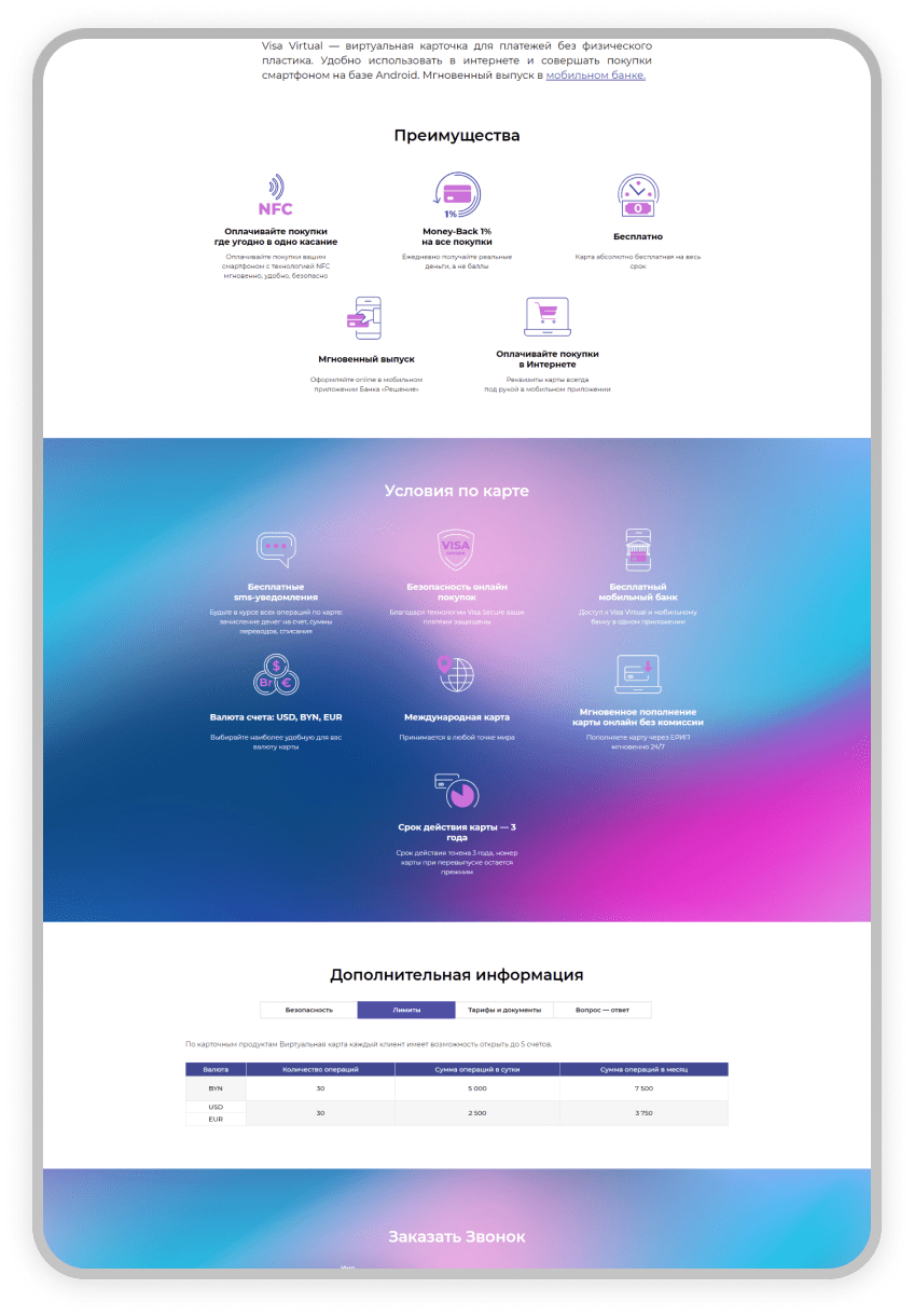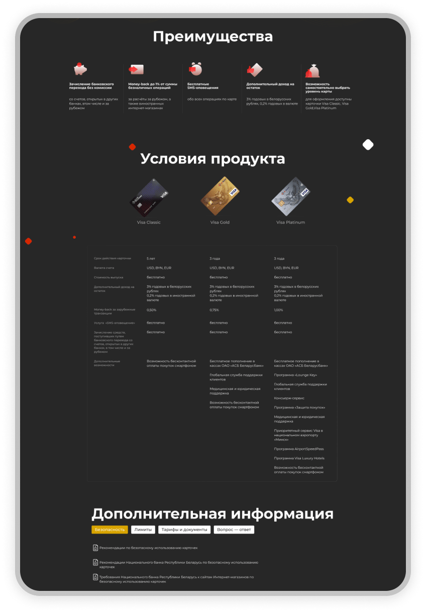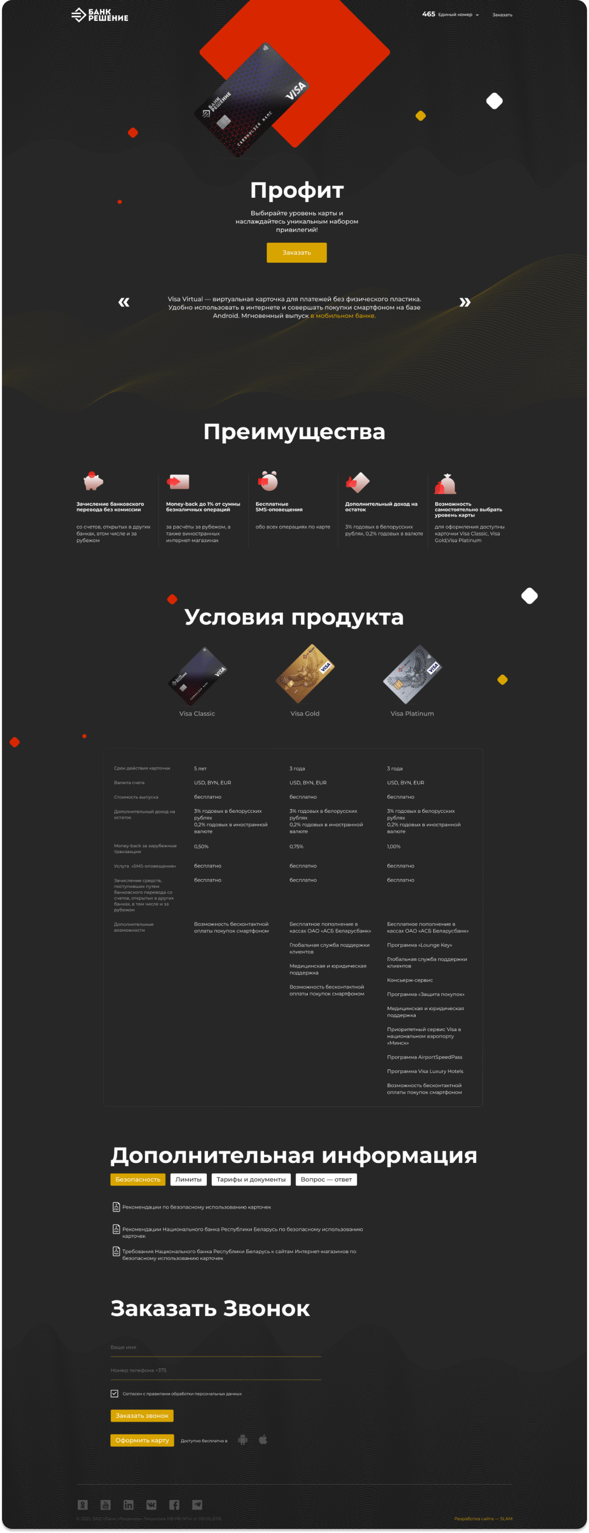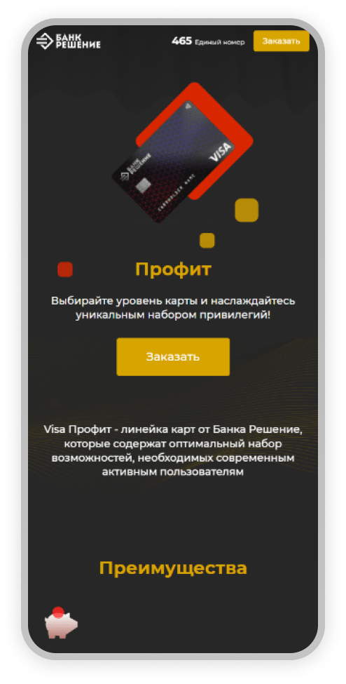 Еще один классный лендинг, который мы разработали для линейки банковских карт Профит. Visa Профит — линейка карт от Банка Решение, которые содержат оптимальный набор возможностей, необходимых современным активным пользователям.
