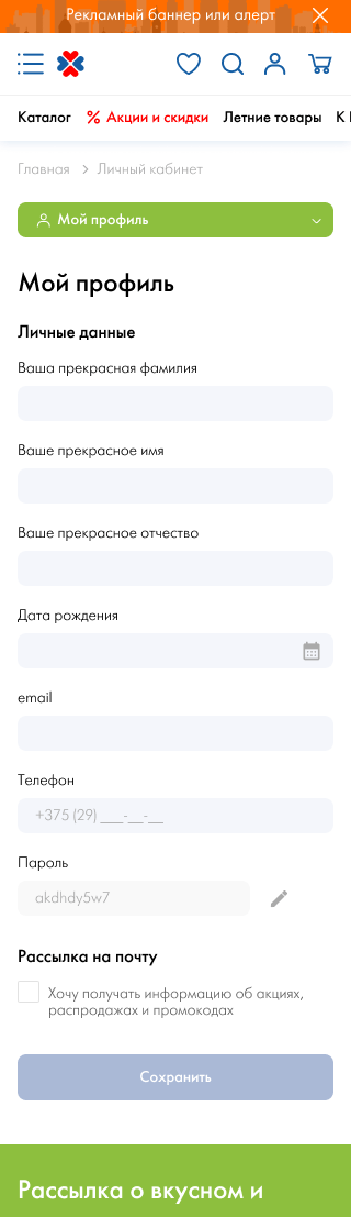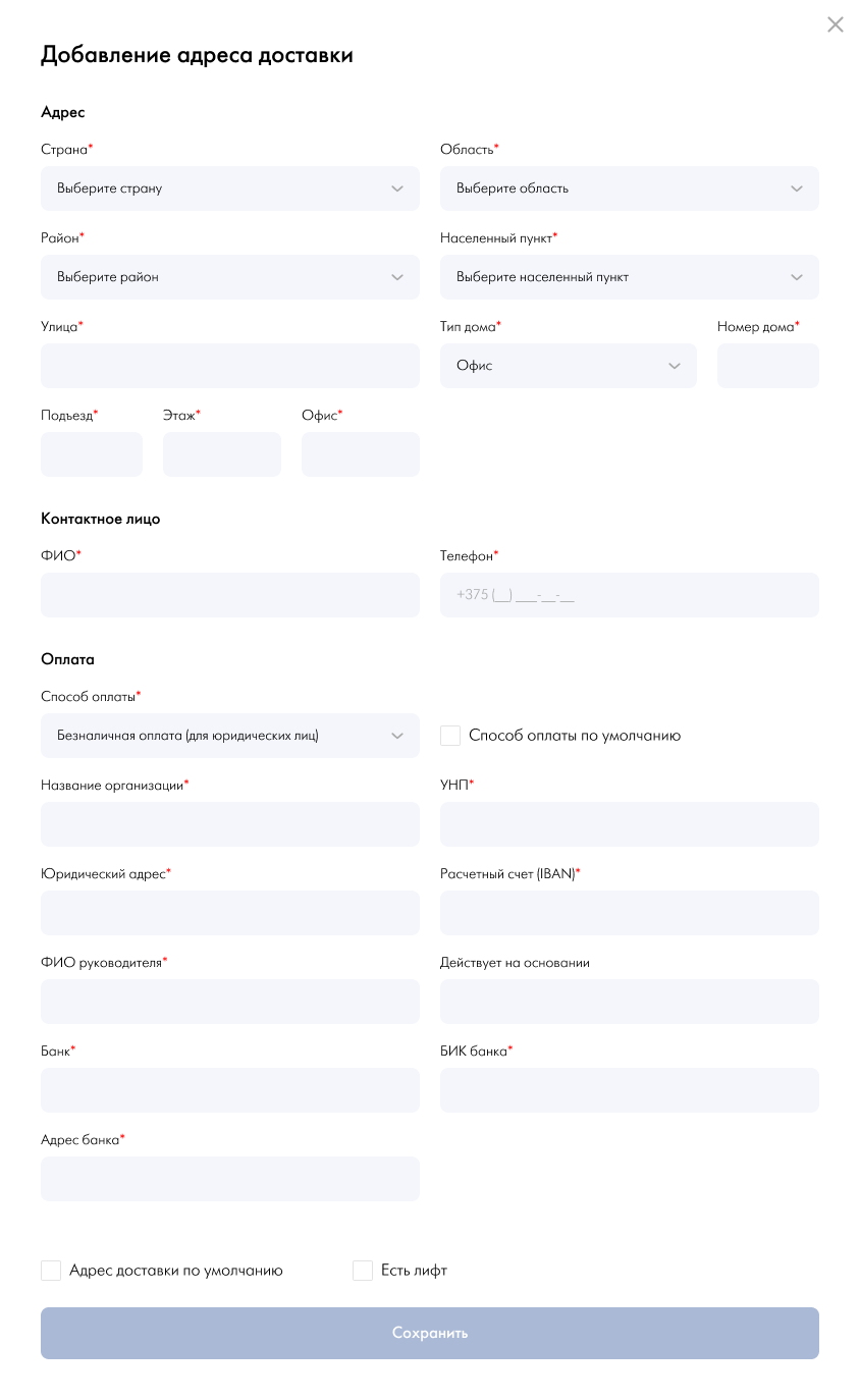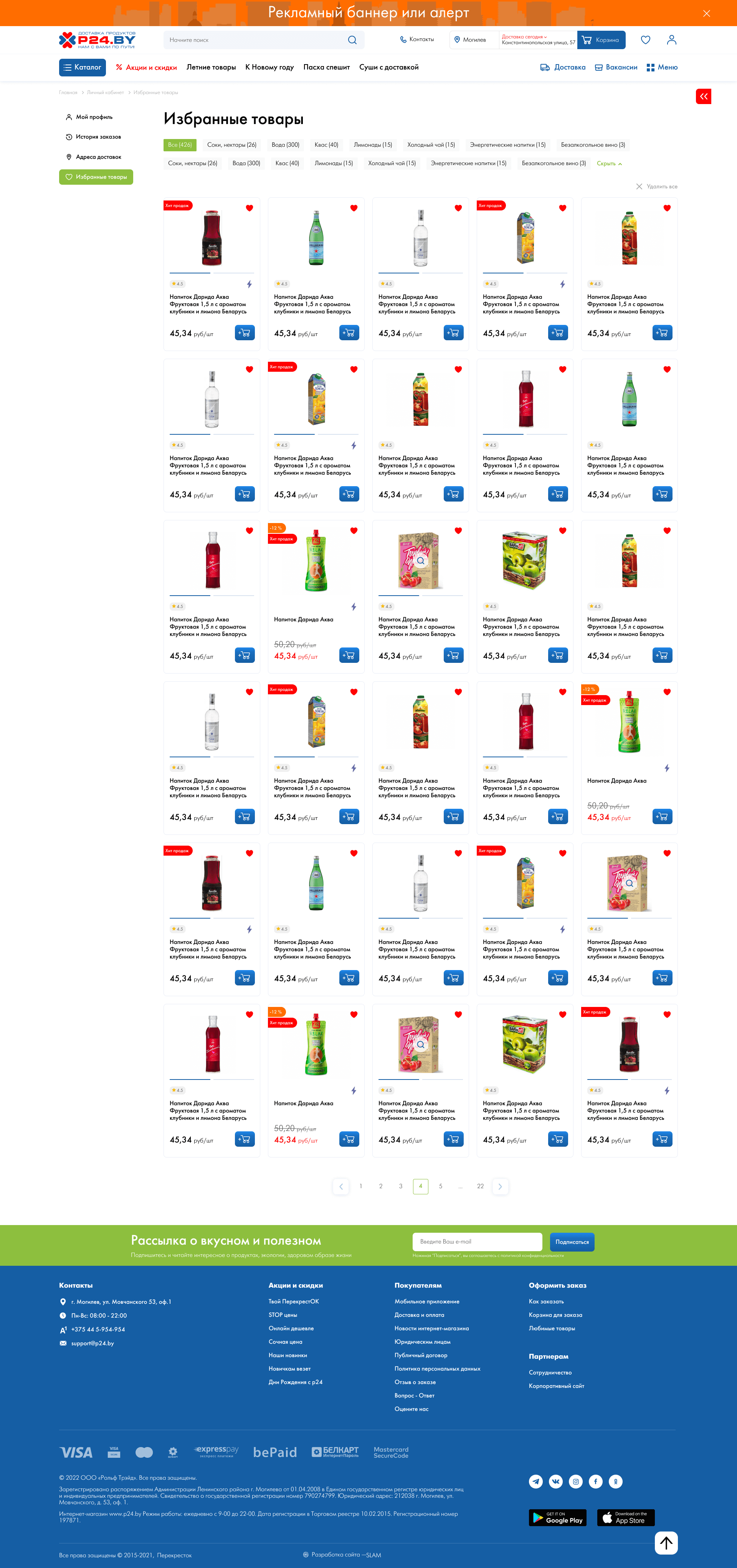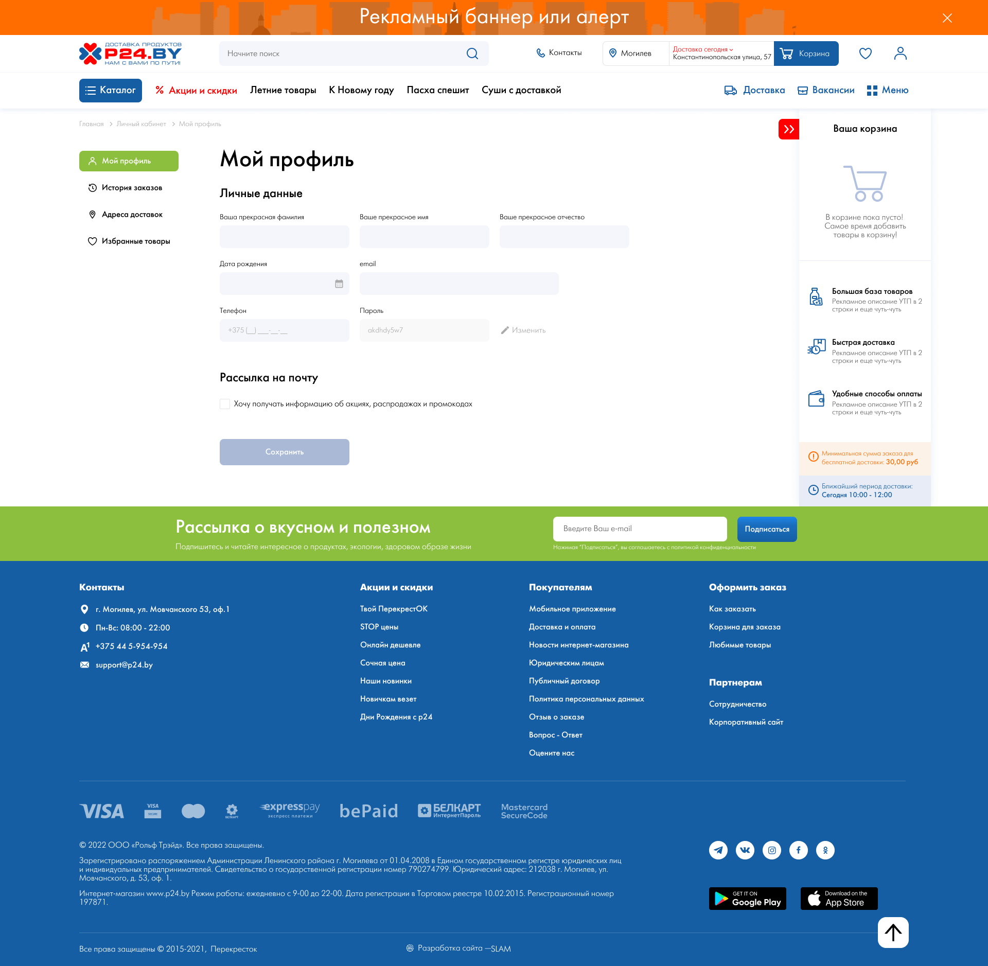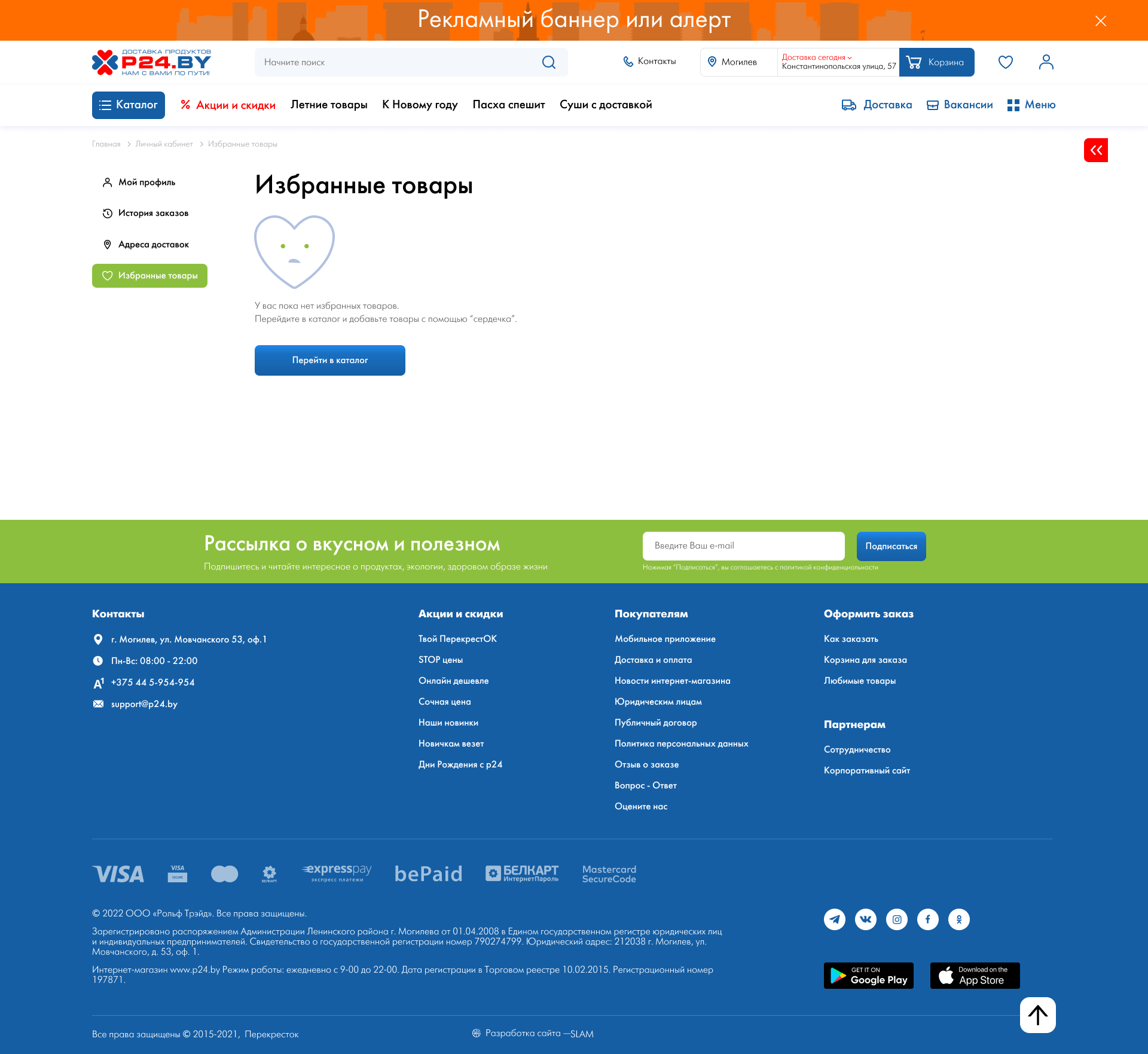На сайте реализован классический личный кабинет пользователя: профиль, адреса доставки, избранное, история заказов.