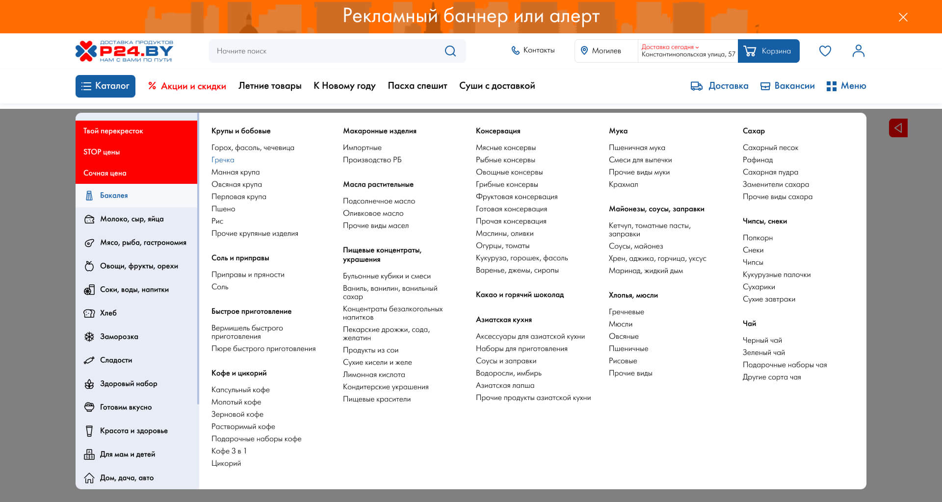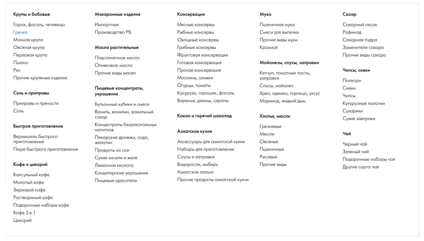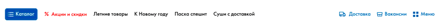 Мы использовали наше классическое продуманное меню, где пользователь видит сразу 3 уровня каталога и может быстро найти нужную категорию.