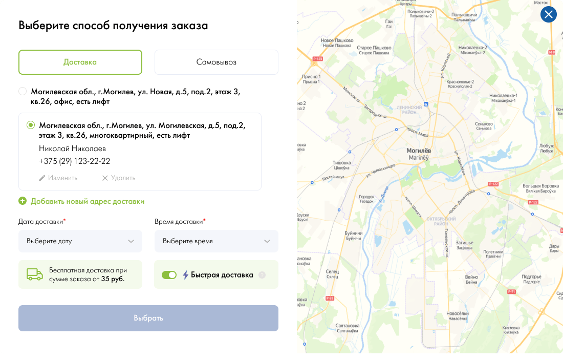 - выбор способа доставки: мы разработали сложный модуль доставки с выводом зон покрытия;