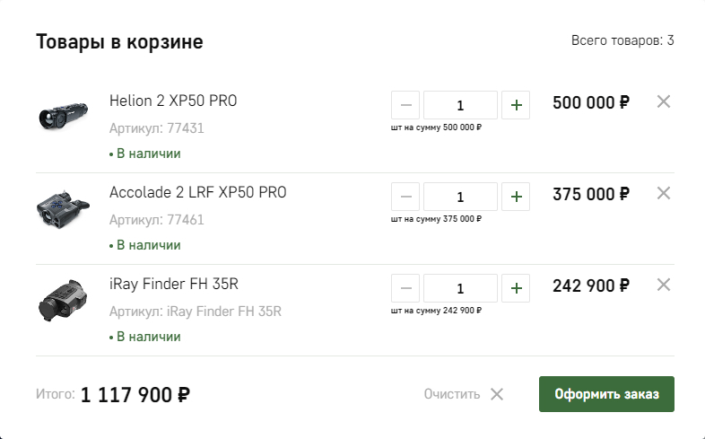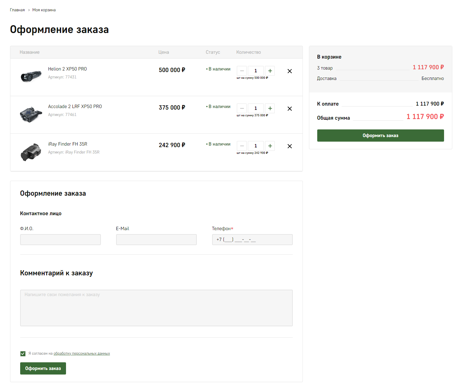 Корзину и оформление заказа мы специально сделали максимально упрощенными. Рика занимается продажей в достаточно дорогом сегменте, кроме того в сфере товаров для охоты часто требуется профессиональная консультация. Поэтому мы совместно с Заказчиком решили не усложнять корзину сложными условиями доставок и выбора оплат. Заказчик должен просто оставить свои данные и сформировать заявку. Далее всю работу по продаже сделают профессионалы-менеджеры.
