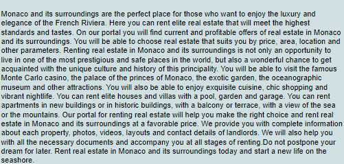 Основным и ключевым направлением является агентство элитной недвижимости на Лазурном берегу Франции и в Монако. В летнее время компания оказывает услуги по аренде элитной недвижимости, параллельно предоставляя сопутствующие туристические услуги: аренда авто, бронь трансфера, полеты на вертолете, резервация частных самолетов, организация мероприятия и др. Помимо недвижимости компания занимаемся арендой и продажей яхт.