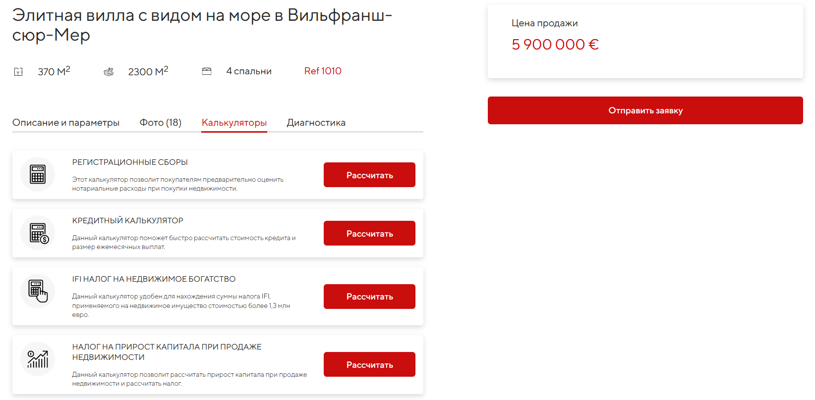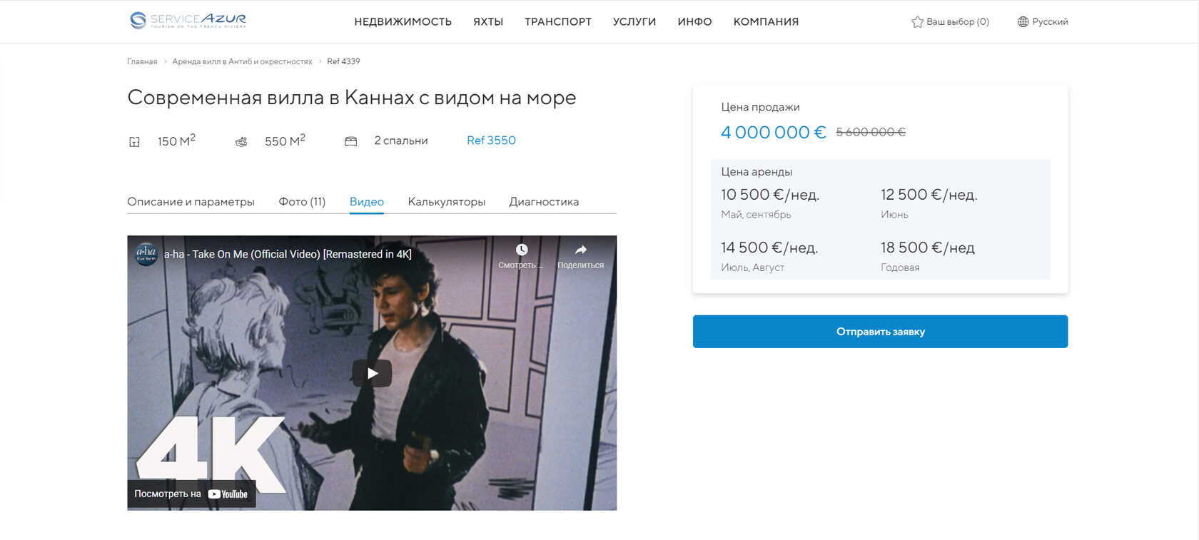 Карточка объекта — это функциональная центральная страница проекта. На проекте предусмотрены разные варианты макетов для страниц недвижимости, яхты, самолета и авто.