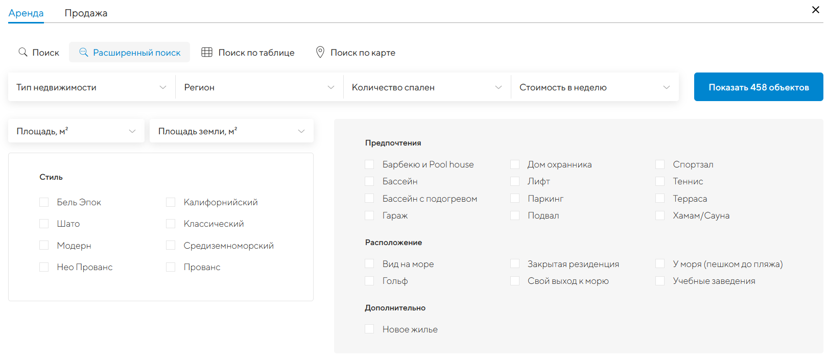 Прямо в выпадающем меню пользователь может воспользоваться разными вариантами поиска объектов: обычный фильтр, расширенный фильтр, поиск по карте, поиск по структурированной таблице. Сделано все, чтобы пользователь мог найти нужный ему объект.