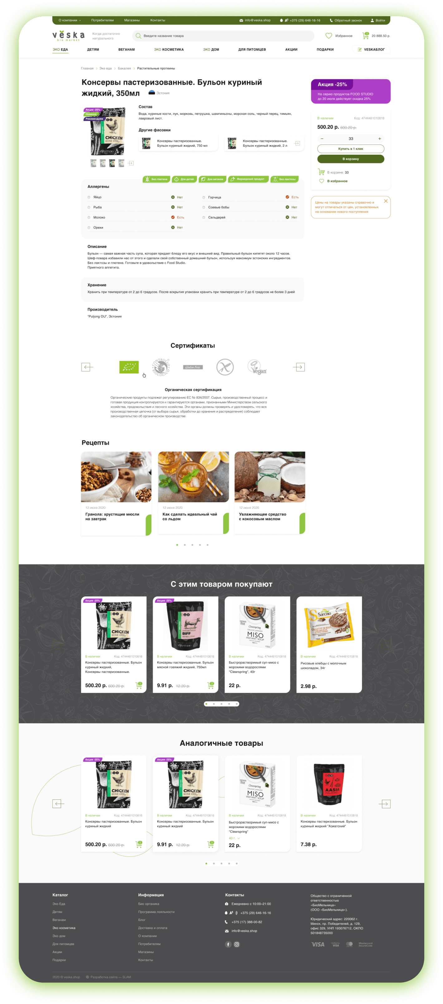 Карточка получилась достаточно объемной. Помимо стандартного функционала комплементарных блоков (с этим товаром покупают, товары-аналоги и др.) мы реализовали функционал рецептов, а также блок с выводом наличия аллергенов в продукте.