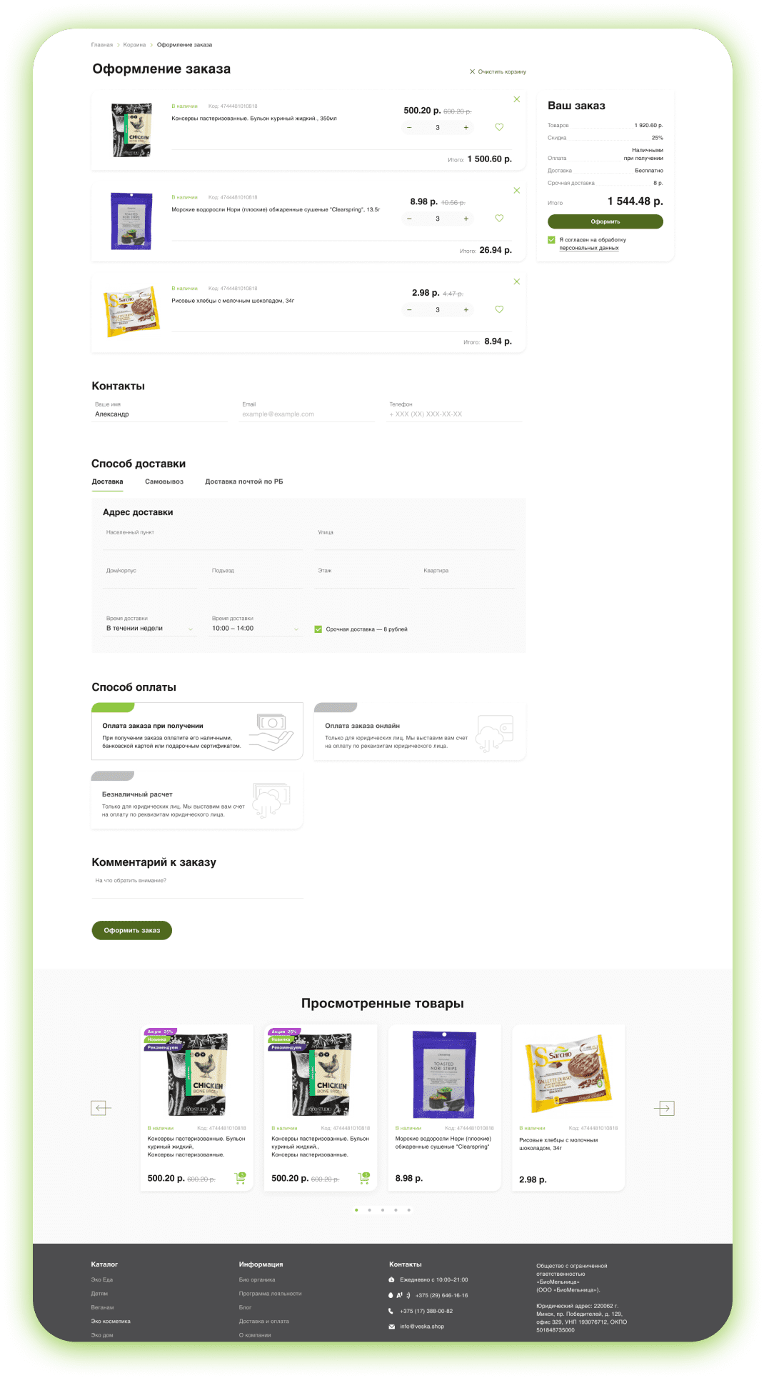 Оформить заказ может как авторизованный, так и неавторизованный пользователь. При оформлении пользователю доступно несколько типов оплат, для оплаты онлайн мы подключили WebPay.